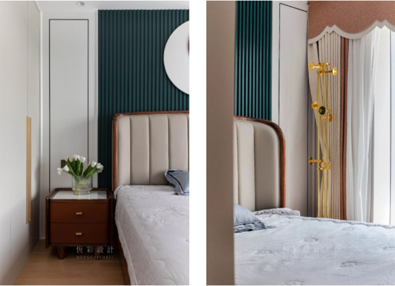 床头不对称布局,一边为床头柜可做物品放置;另一端放置金属衣帽架,带着玩味的复古感,在稳重的优雅中彰显实用性。喇叭音符的造型,仿佛能让人陶醉于音符之间,黄铜表面保留材质本身的温润平和质感。