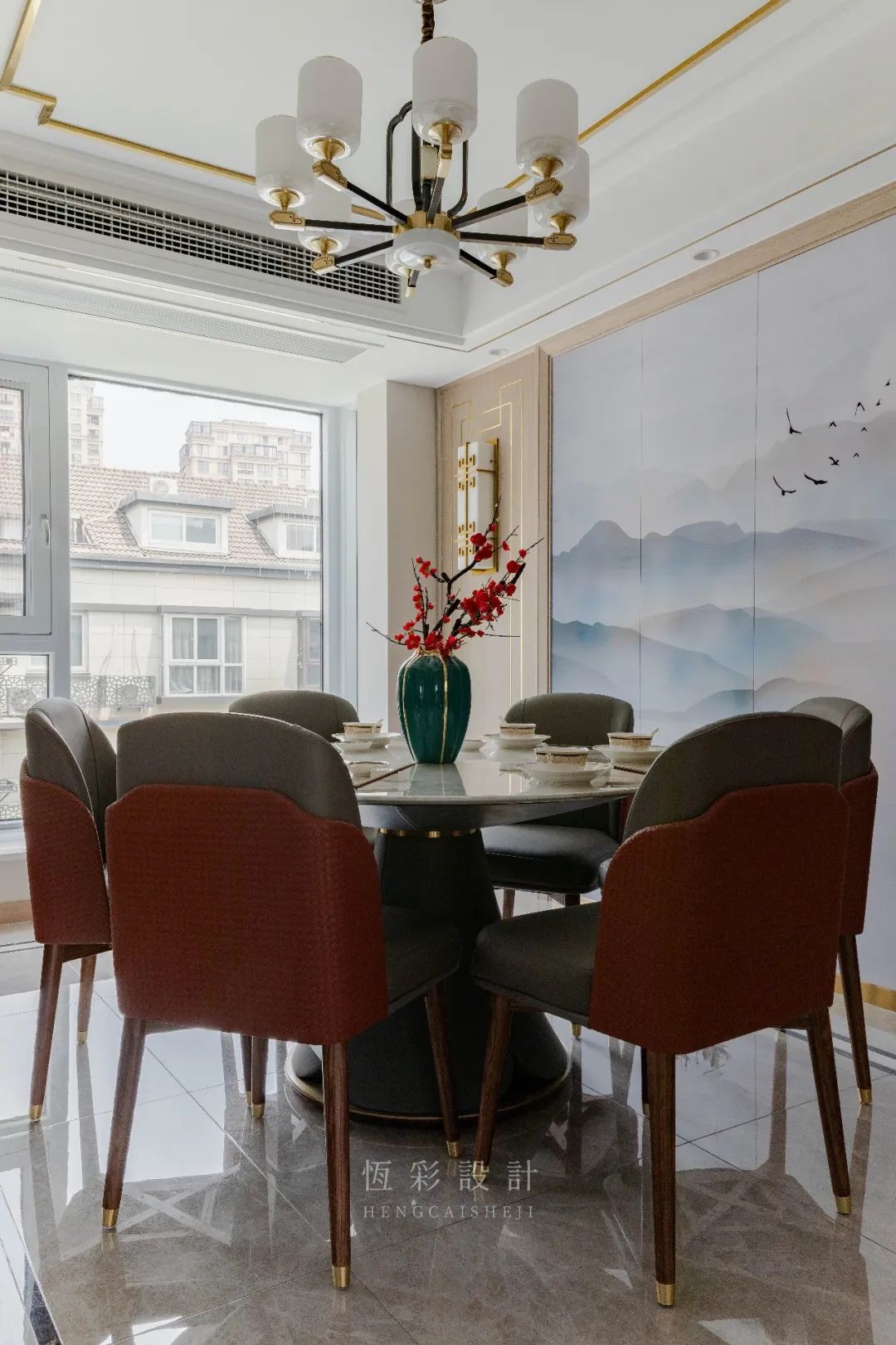 餐桌选择加厚的岩板台面,底座金属线条镶边更觉精致。6把皮软包汉克椅,红与灰的色彩搭配,轻松打造休闲感,也从细节处体现出结构之美。