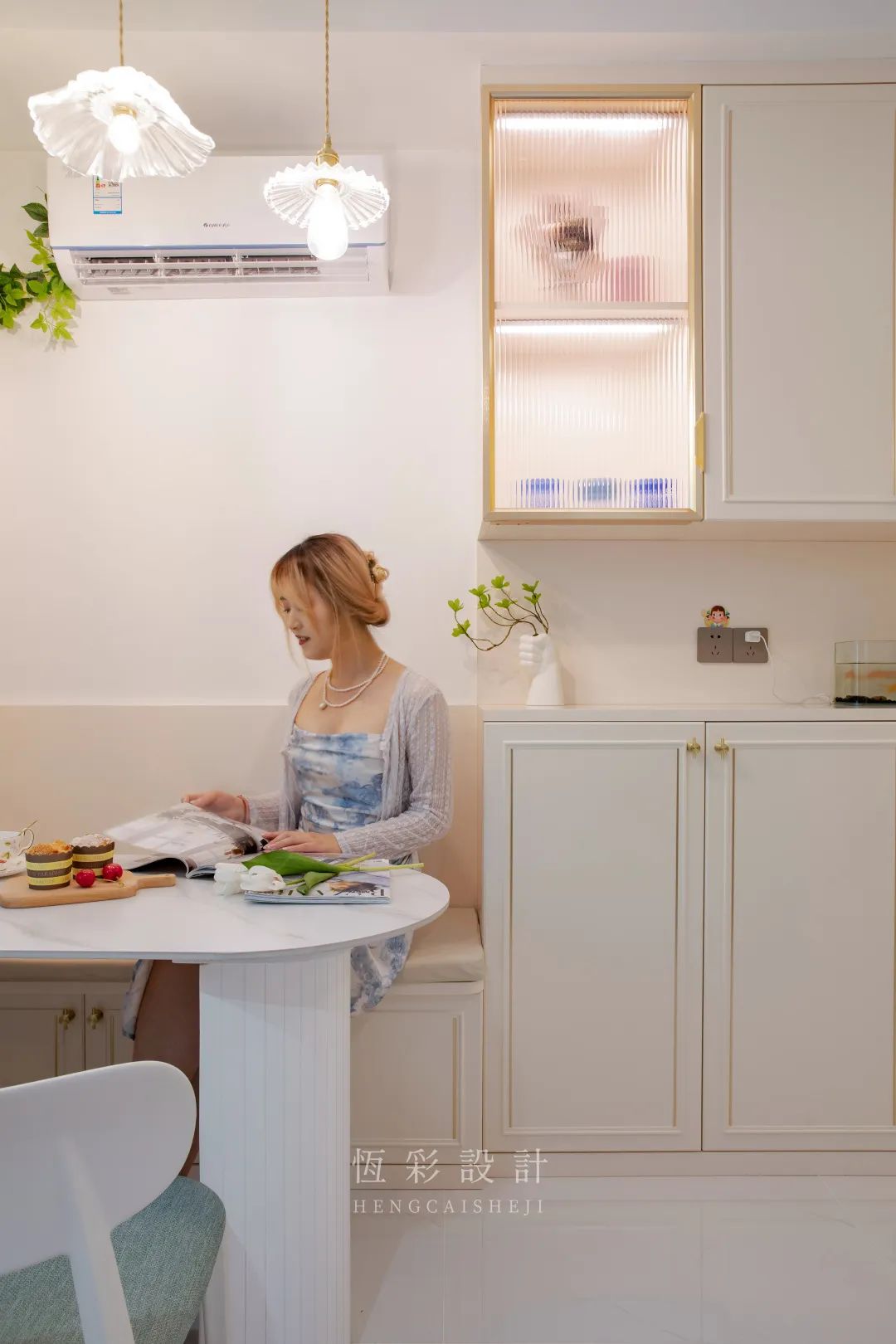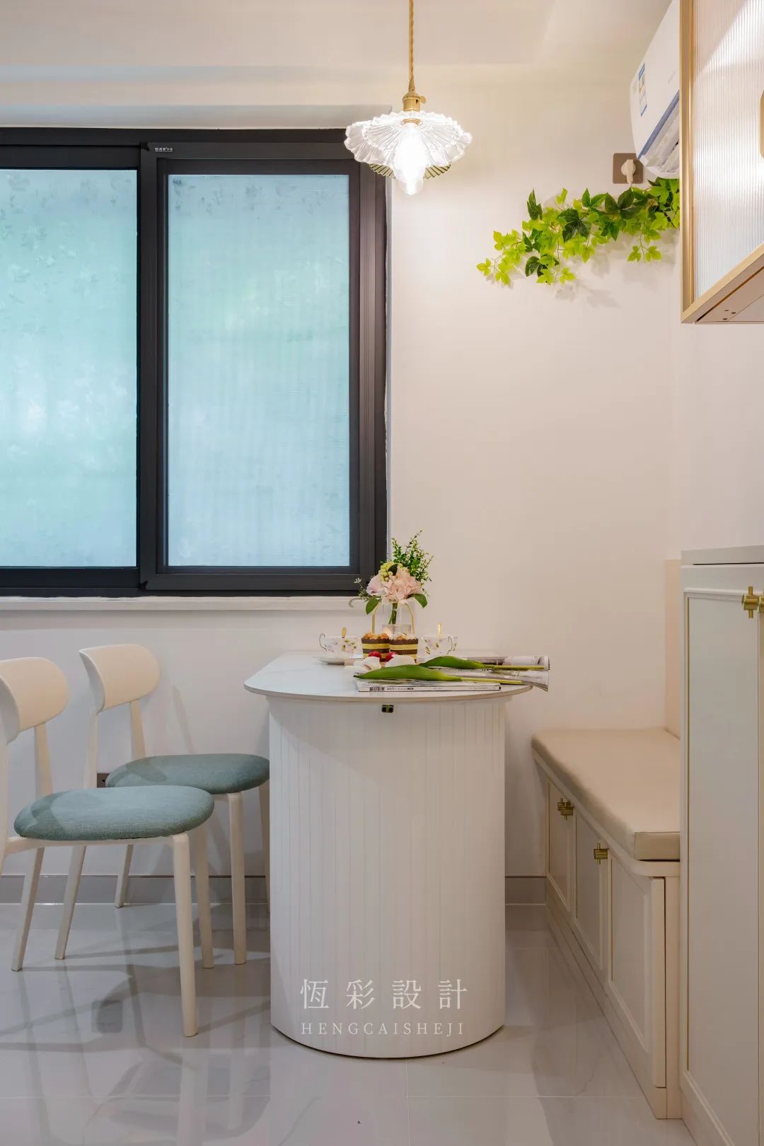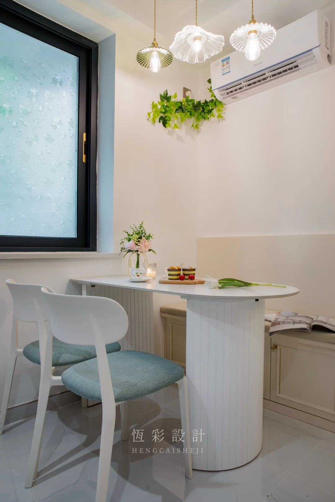 网红餐桌与卡座的组合,再搭配三盏玻璃小吊灯,与其说是餐厅不如说是法国街头的咖啡馆,约上姐妹一二,午后来一杯香草咖啡吧。