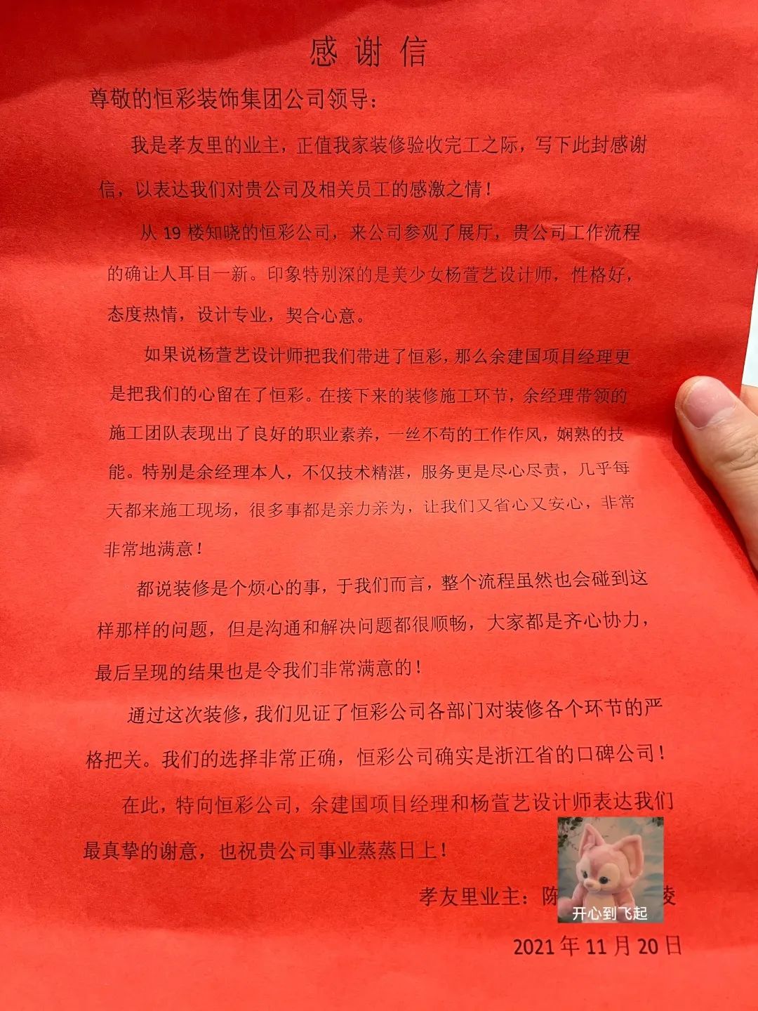 屋主目前已经入住,表示和杨设计师十分投缘,对装修过程也非常满意,前不久特意送来感谢信与锦旗,我们也衷心祝福屋主生活幸福,平安顺意。