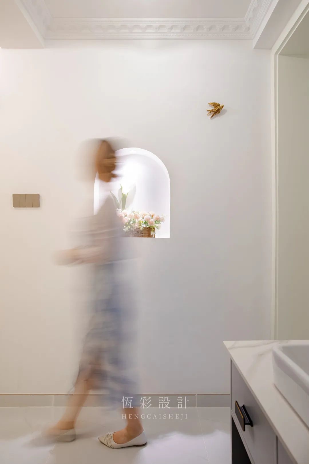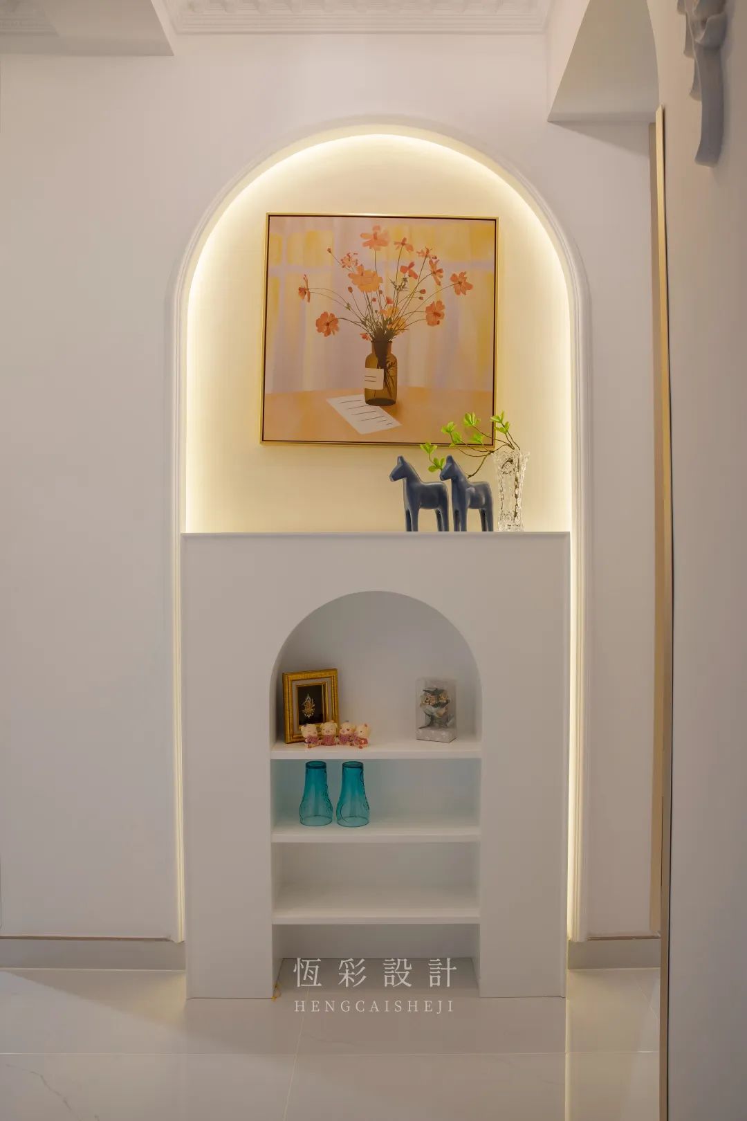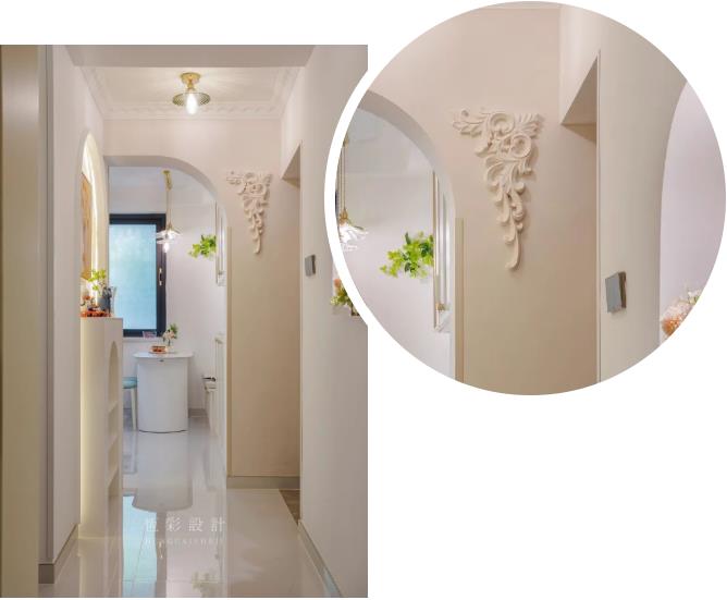 进门增加玄关设计,法式拱门端景台、改造的半拱形门洞、独特法国风情的墙饰等元素,表达着轻法式的高贵典雅。