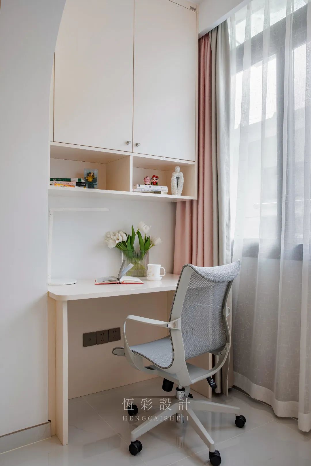 阳台一侧定制整体组合书柜+书桌,充分利用阳台空间打造出休闲办公区,非常实用。桌下提前预留充电口,方便手机、ipad充电。