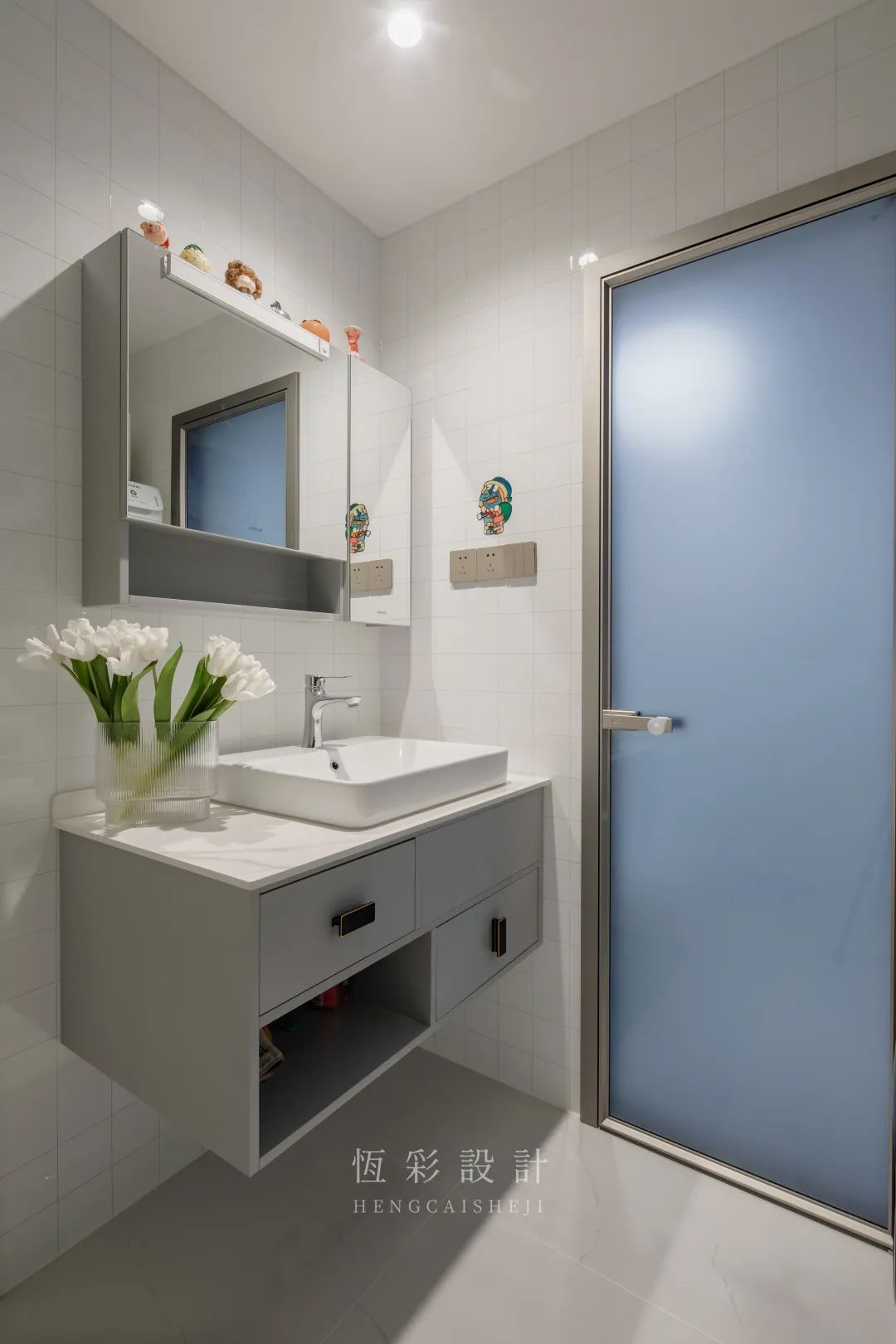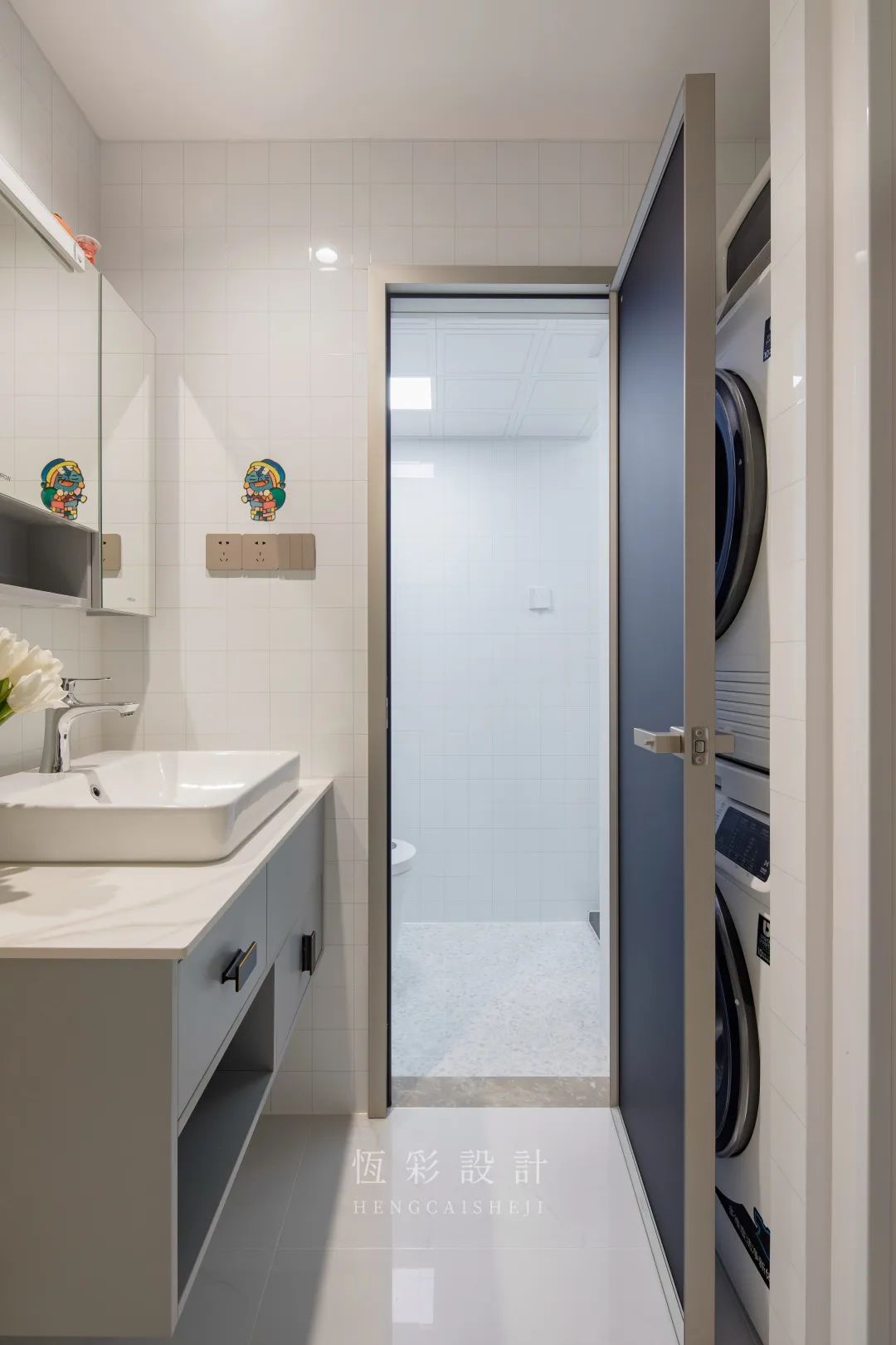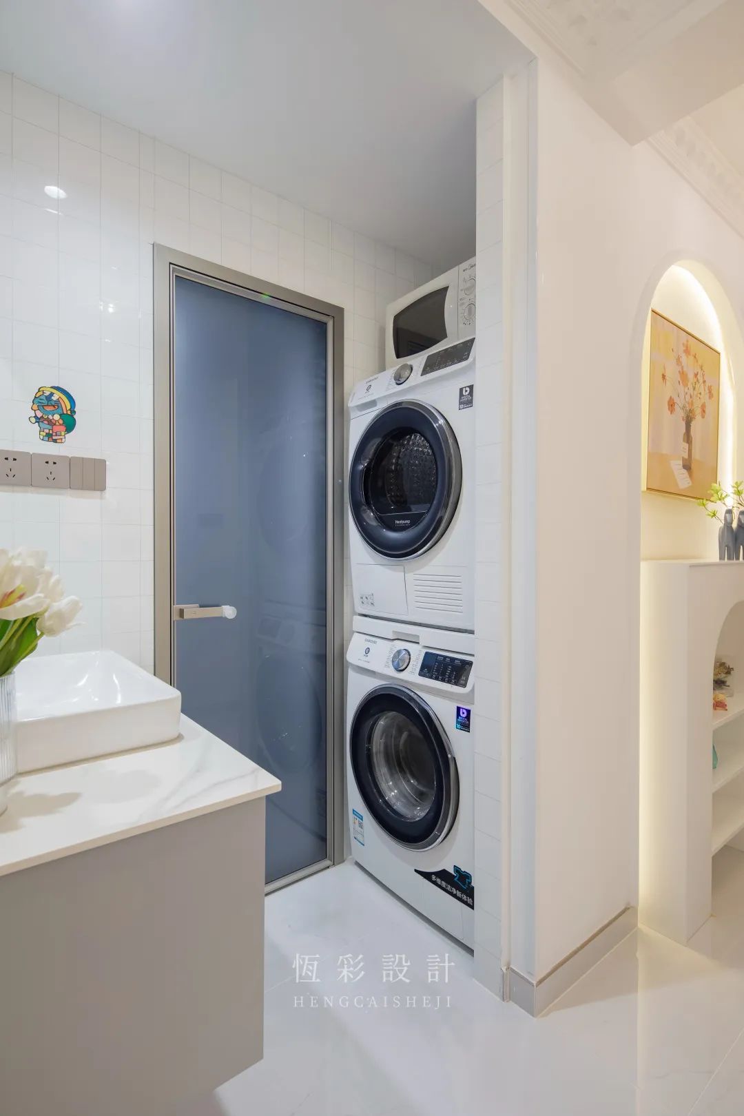 左侧靠近淋浴房,嵌入洗衣机+烘干机,淋浴后顺手衣服填进洗衣机;右侧靠近厨房区域,嵌入冰箱,方便拿取食材,符合屋主二人的生活习惯,动线合理。