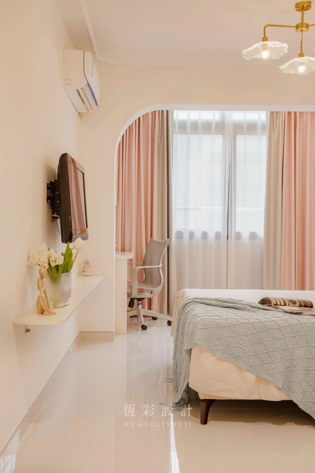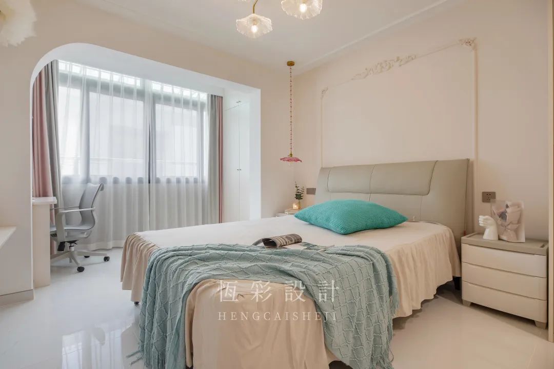 主卧与阳台门洞做半拱形处理,与入户的拱形门洞隔空呼应,瞬间拉高颜值。床尾电视柜下方定制了单层板当作简单置物架,隔板边缘贴心做了圆角设计。