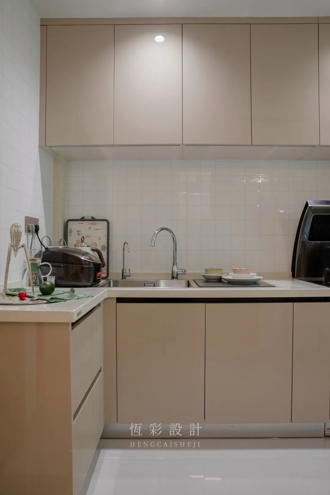 屋主热爱烹饪,平时很少外食,所以厨房的收纳功能及操作台面一定要做足。满墙定制欧派的吊柜和地柜,增加厨房的储物空间, L型厨房设计扩大了可操作的台面空间。