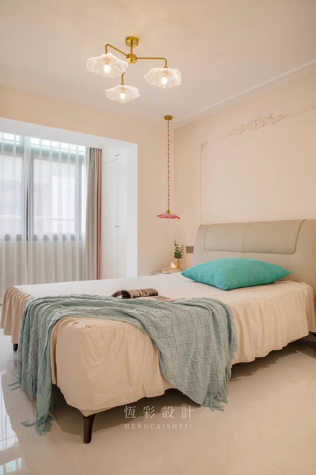 床头的粉色荷叶玻璃灯彰显着女屋主不老的少女心。