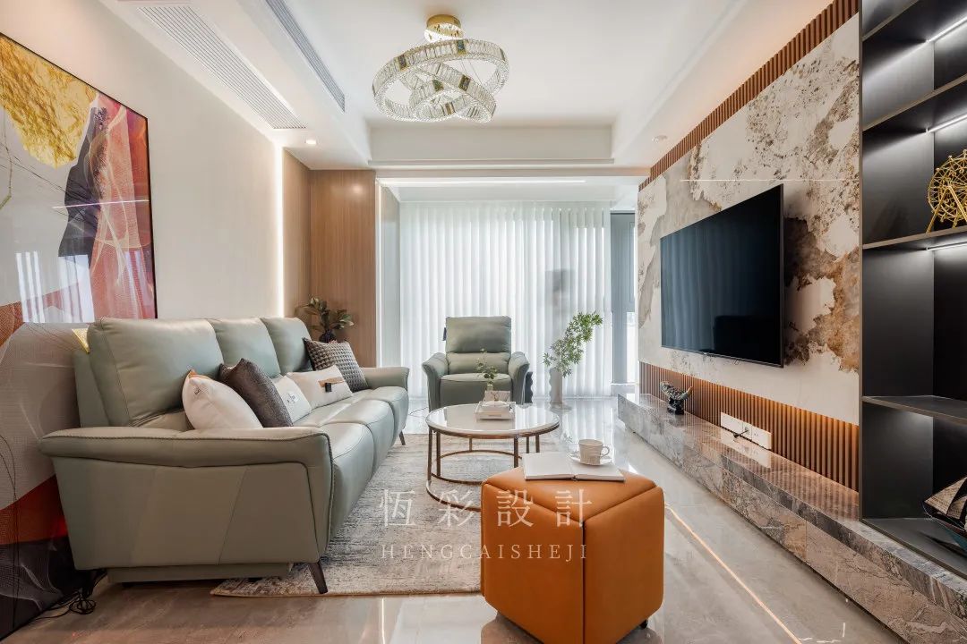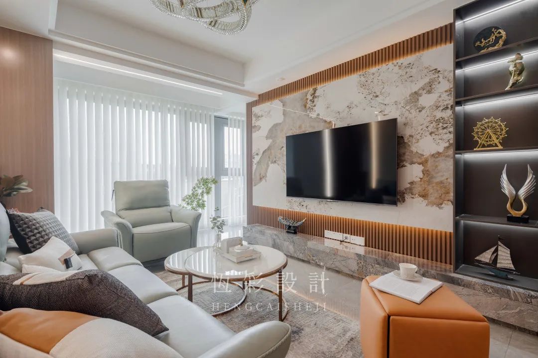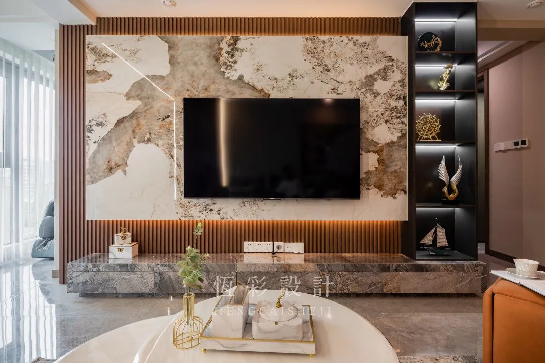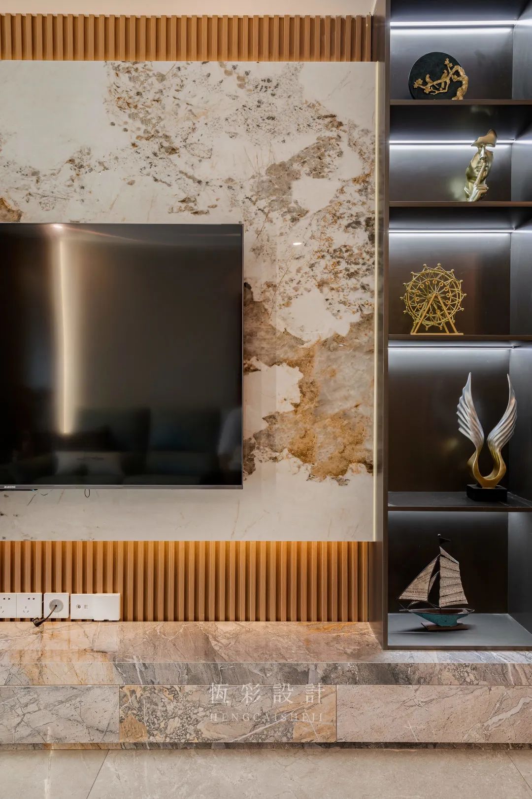 木格栅与大理石的组合作电视背景墙,平整大气,两种材质的叠加,空间立体感就出来了