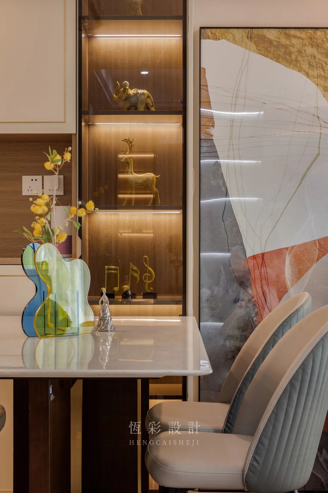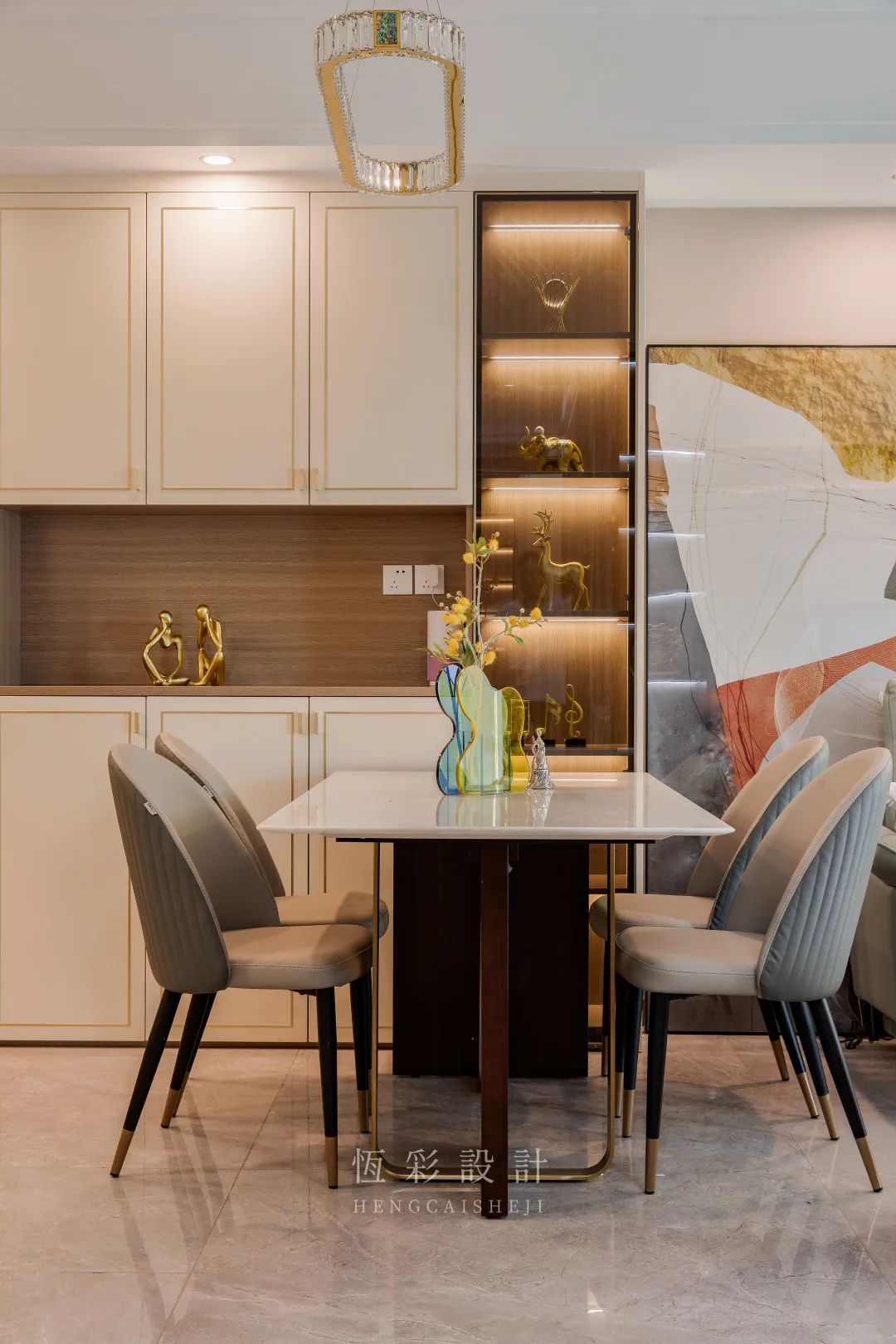 定制餐边柜兼顾展示功能,每格加灯带渲染效果;腰部位置预留插座,方便手机充电或使用小家电。