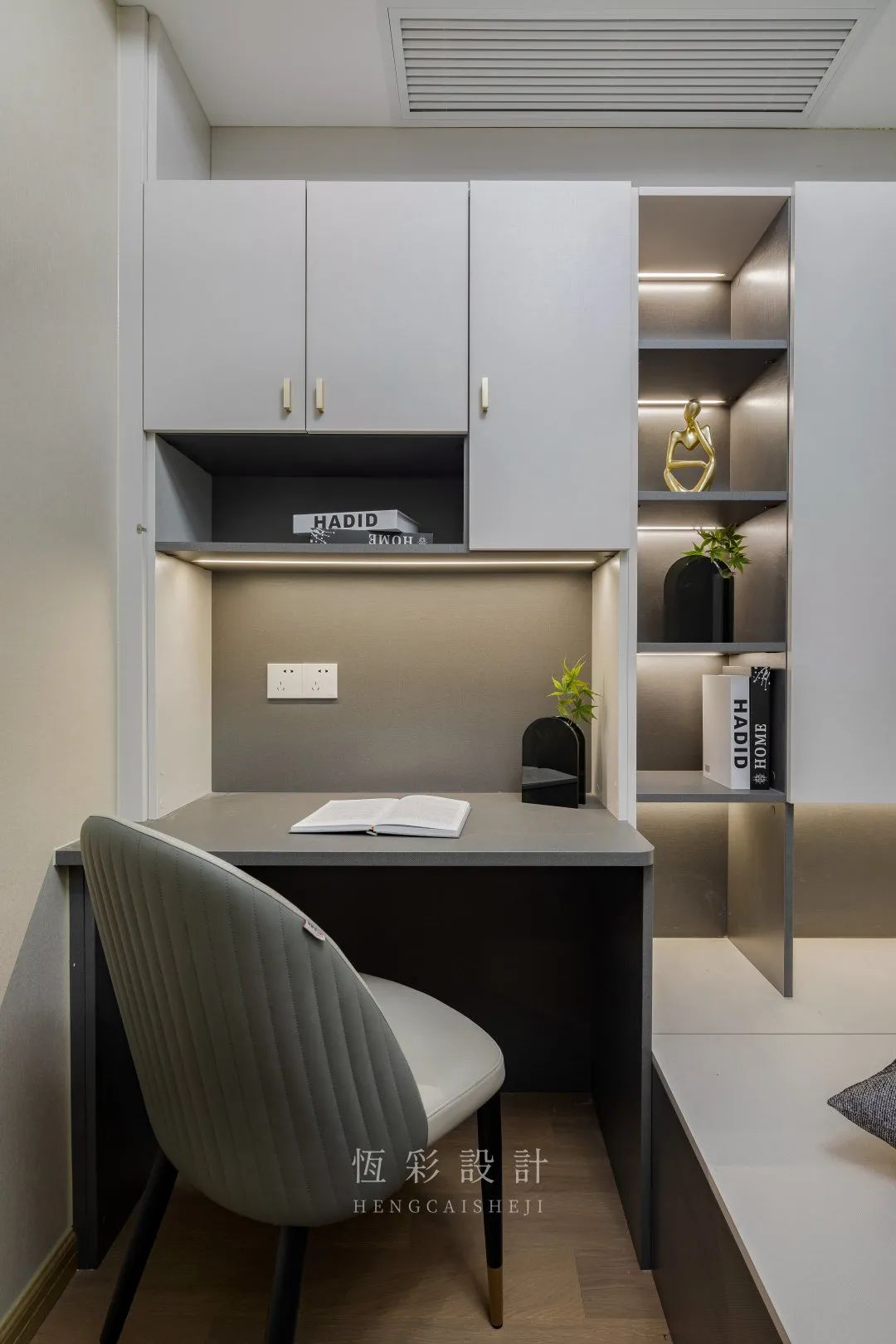 组合式的收纳柜收放自如,灯带设计增加氛围感。书桌顶部也加了灯带替代台灯。