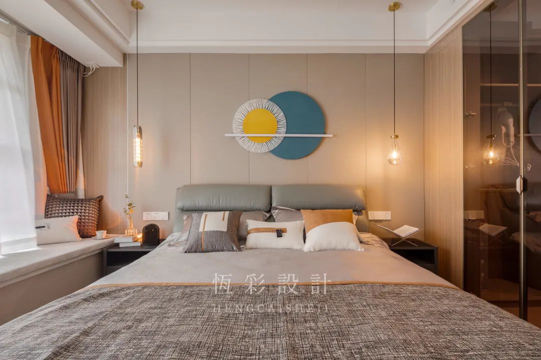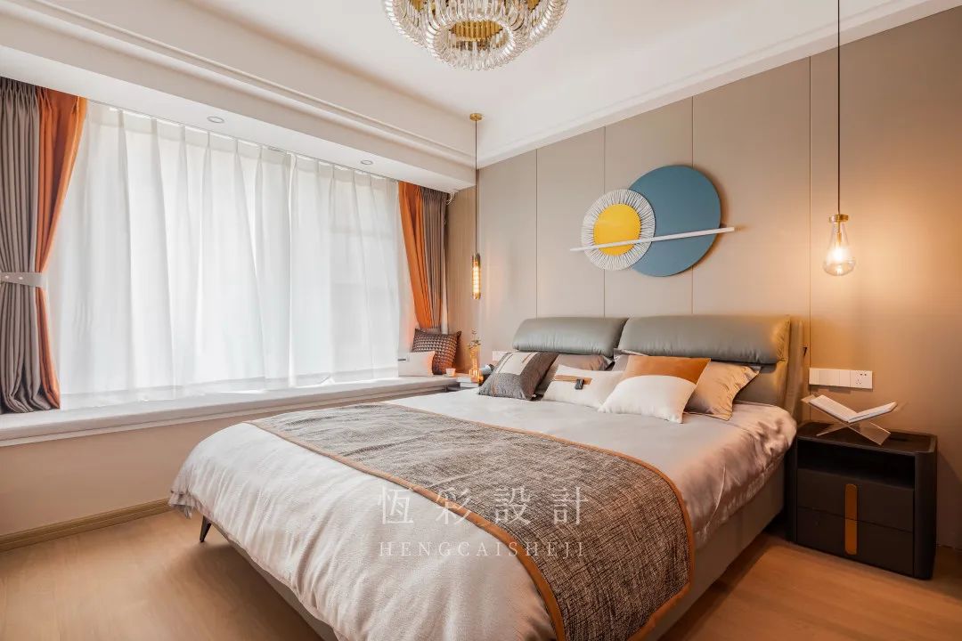 主卧采光不错,保留飘窗作为休闲区。背景墙拼接了木饰面和硬包,吊灯也是不规则的,不知不觉,有限的空间里就增加了设计感。
