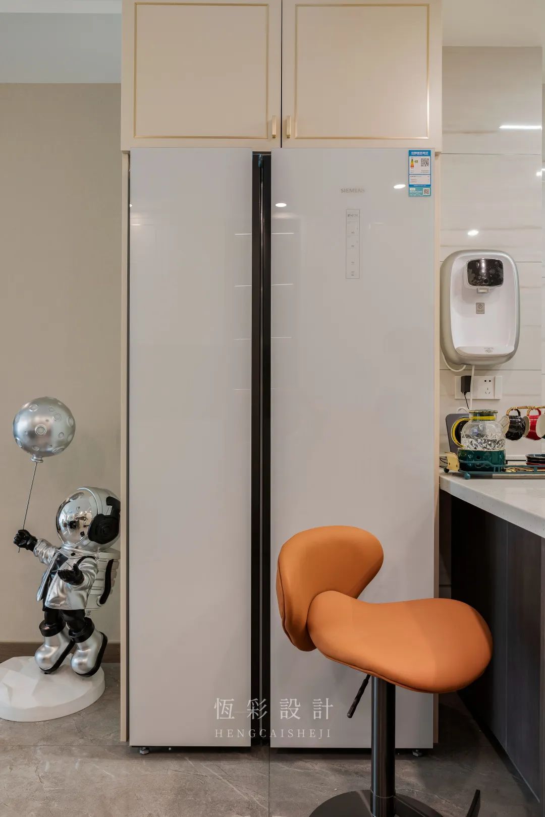 冰箱靠近吧台嵌入定制柜,取出食材直接放在台面上非常方便。