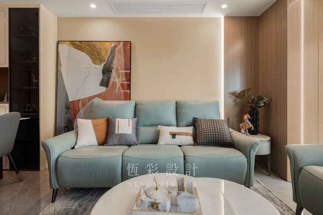 简单的乳胶漆拼接木饰面构成了沙发背景墙,接口处以线条灯点缀,解了墙面的枯燥。再来一面大幅装饰画,瞬间生动了不少。