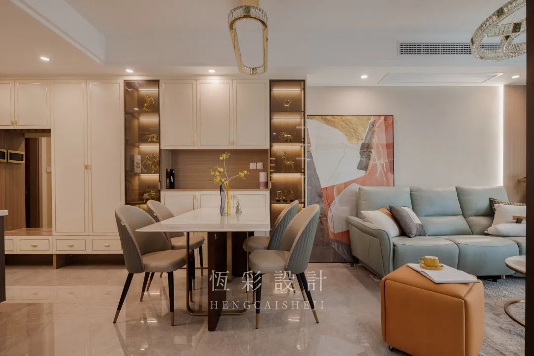 餐厅位于动区中央,采光是硬伤。主灯+筒灯+灯带保证充足照明。