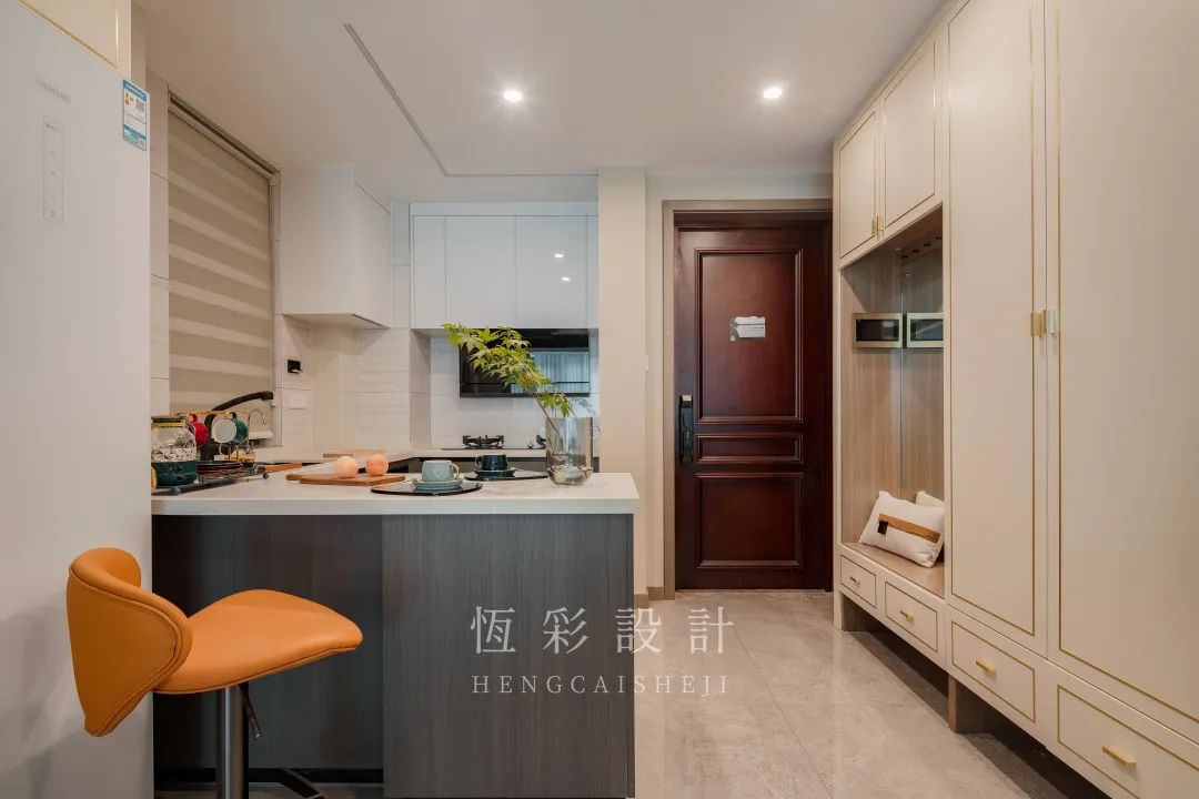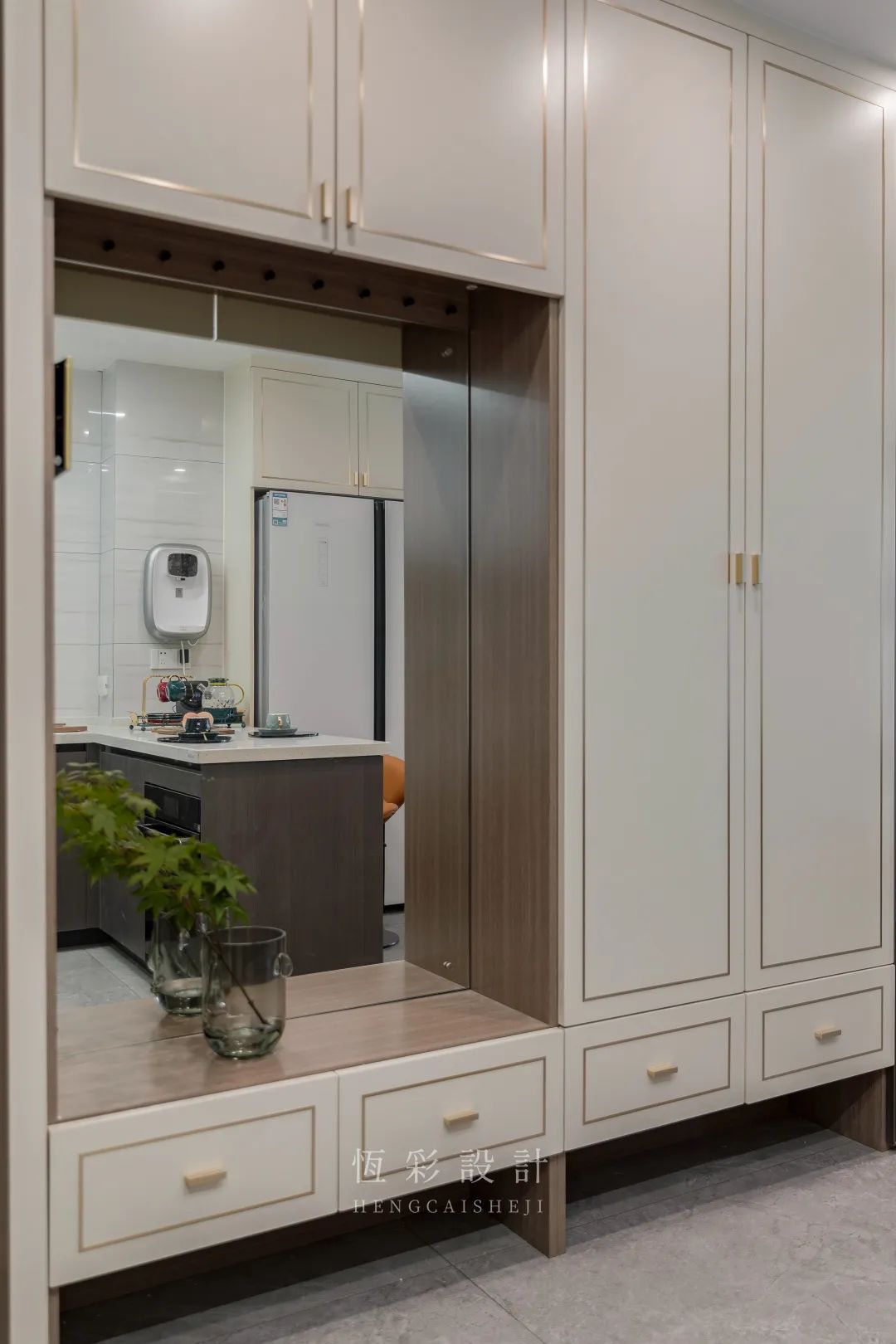 入户靠墙定制玄关+餐边收纳柜。玄关柜定制不同高度层板,底部抽屉,实现分区收纳;安排超大全身镜,方便出门整理仪容。