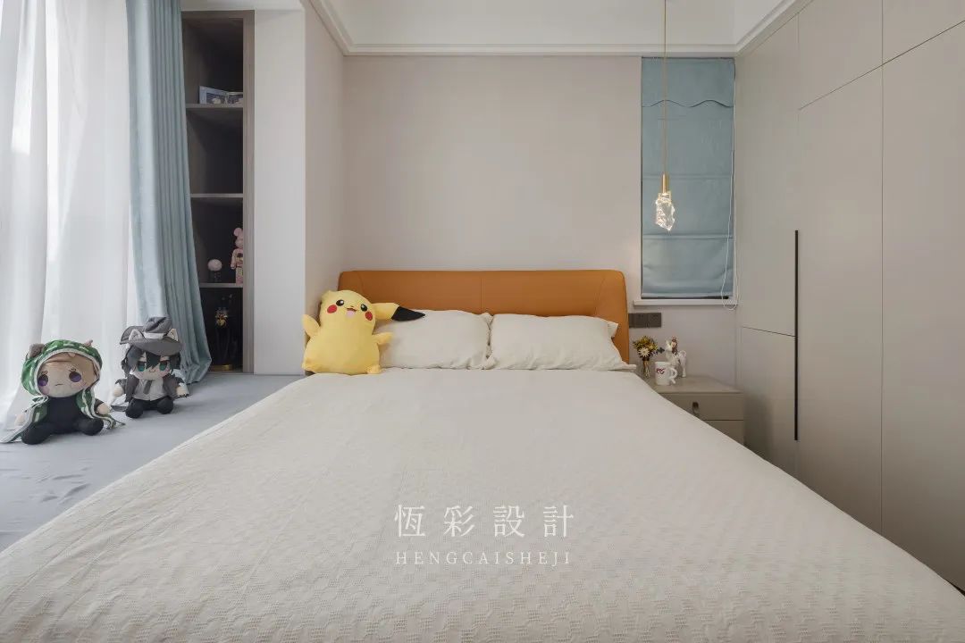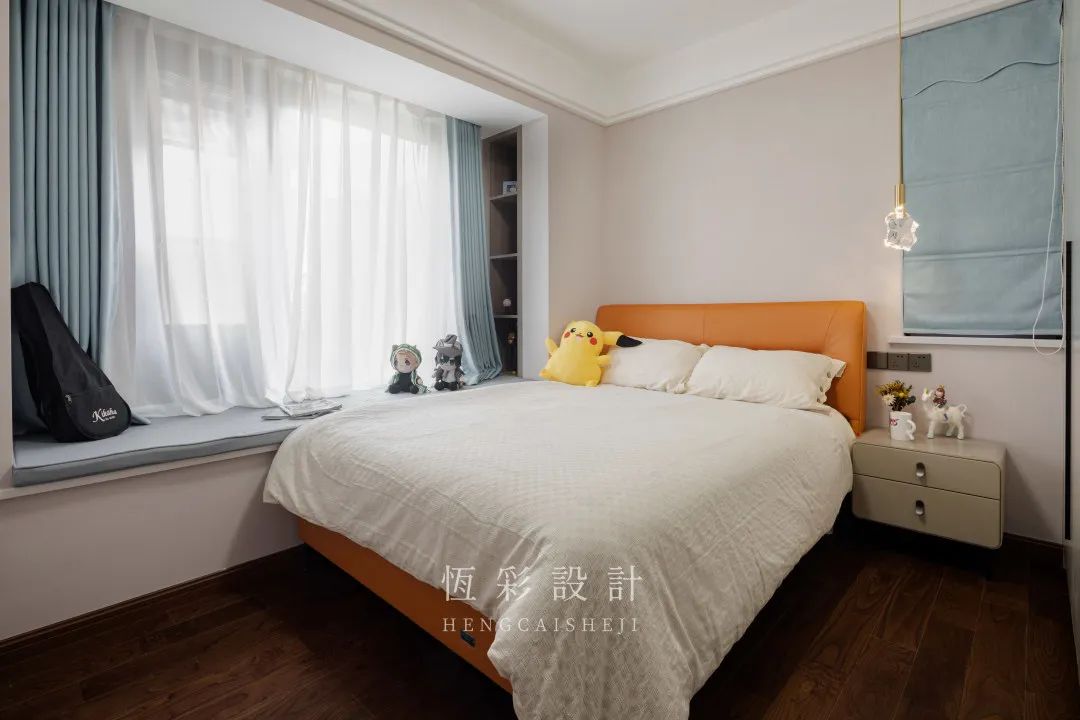 另一个带有飘窗的卧室作为女儿房,床紧靠飘窗摆放,充分利用飘窗空间,平时放置衣物、玩偶都很方便。
