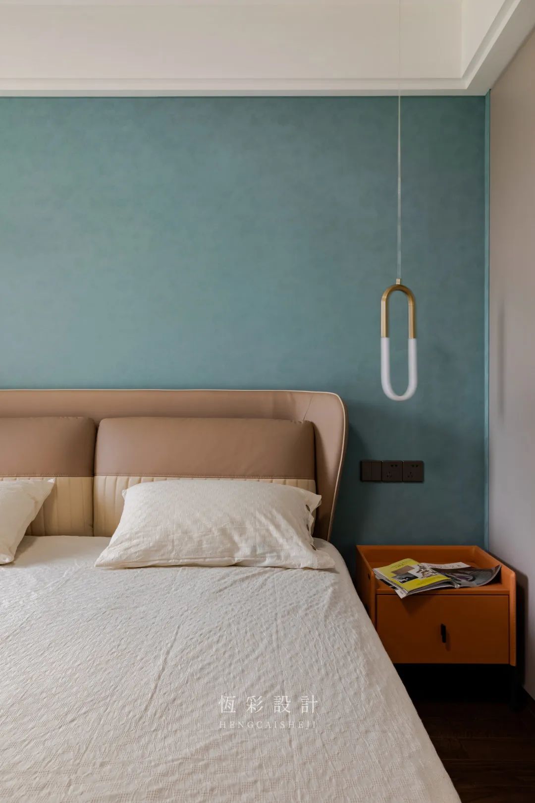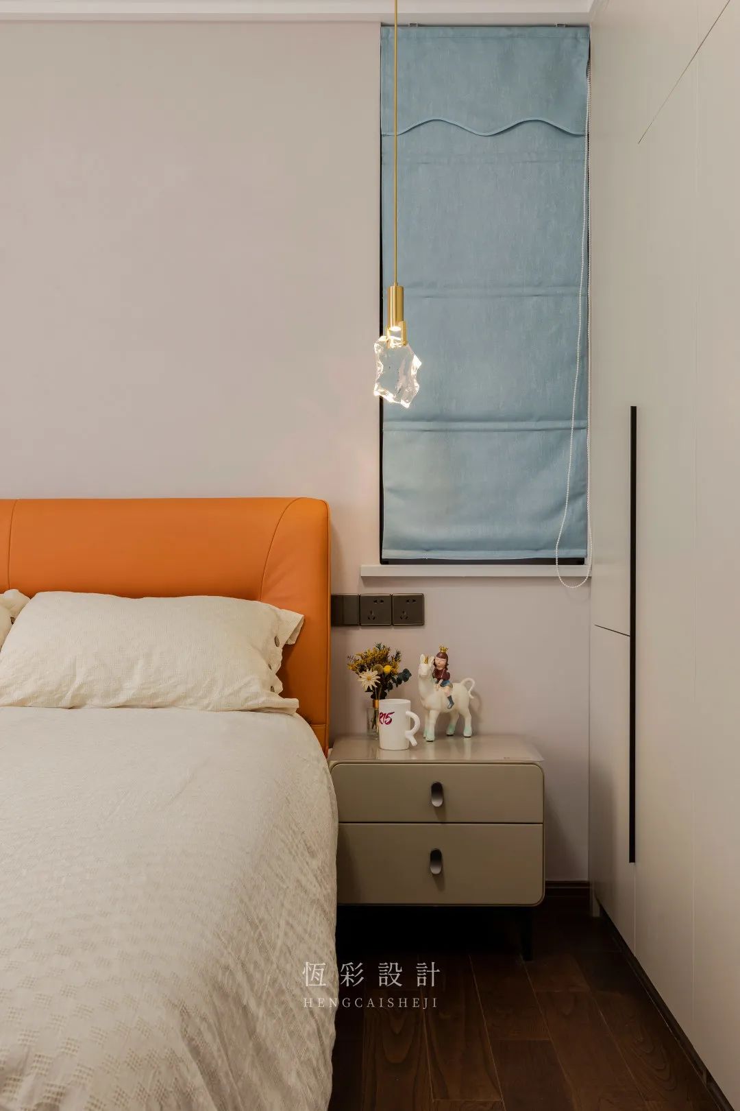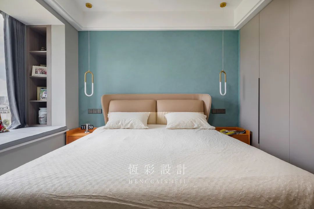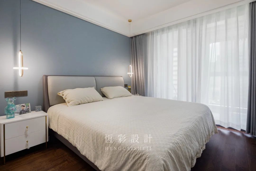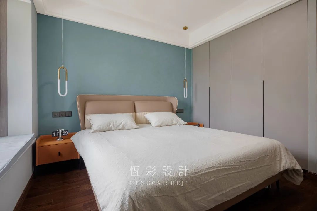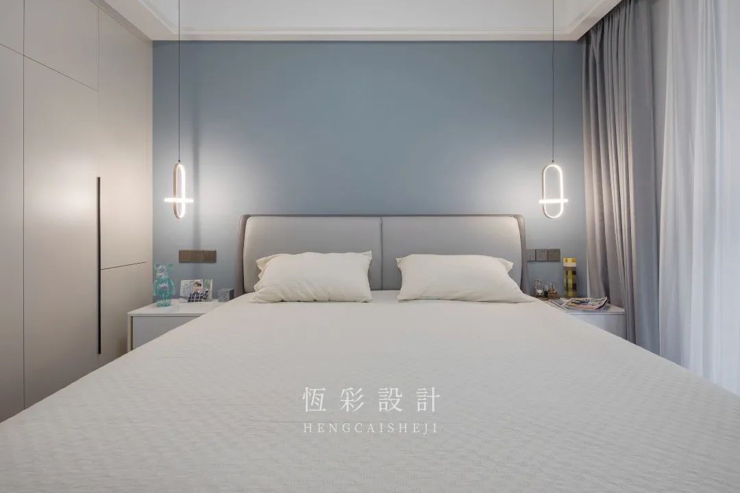 衣柜配色与客餐厅柜体一致,避免视觉上的杂乱感。对称的吊灯替代台灯,时尚感up。