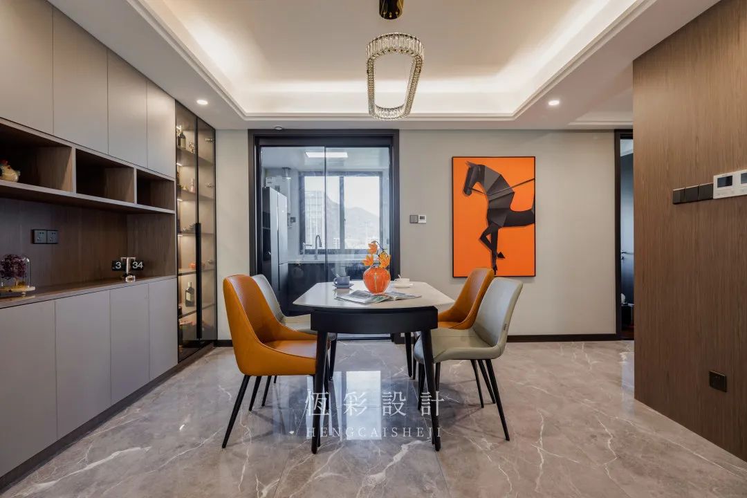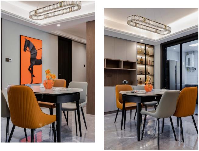 现代感的大理石餐桌椅颜值高又实用,轻奢范儿的餐厅水晶灯格外精致,又为餐厅增色不少。