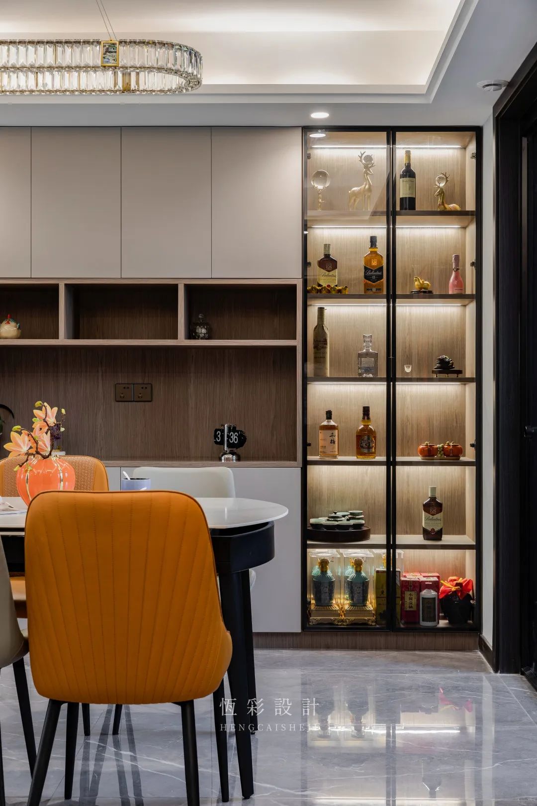 由玄关入户,首先入目的是流光溢彩的酒柜。茶色玻璃柜中,一瓶瓶藏酒摆放整齐,男屋主喜欢藏酒,偶尔也在家小酌,这是一种生活情趣。