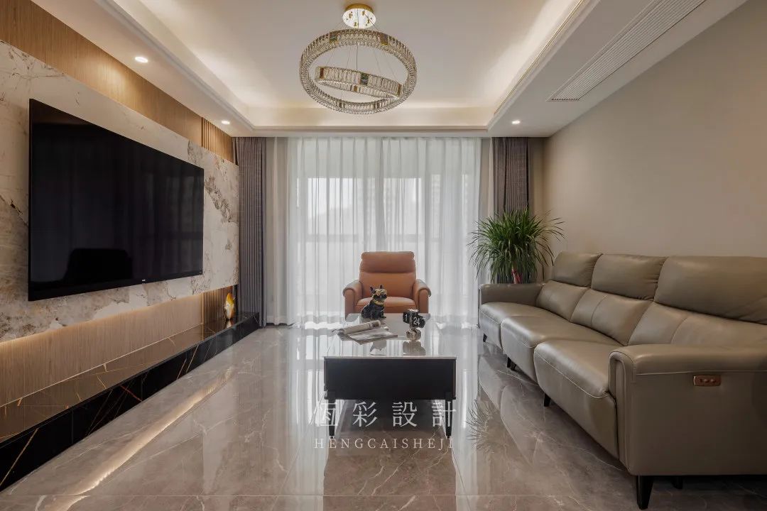 客厅做简单吊顶,同系列的水晶吊灯引人注目,除了主灯之外,辅以筒灯增加照明,另外,吊顶内侧设计灯带制造洗墙效果,氛围感满满。