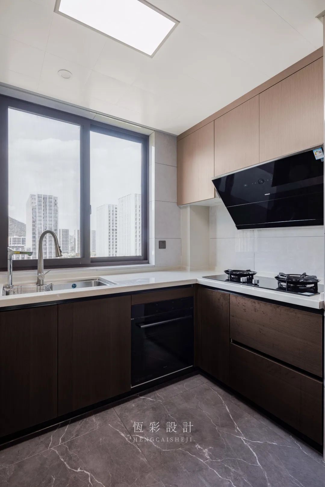 橱柜配色十分考究,经典杏色上柜,深咖色地柜视觉上有层次感又耐脏。嵌入式蒸箱提升厨房幸福指数。