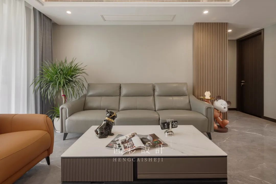 低饱和度的真皮沙发不落入俗套,造型时尚且坐感舒适,沙发背景大片留白,现代感十足,靠近走廊的部分区域以木格栅稍作装饰,不显繁琐,恰如其分的点缀颇有质感。动物边几俏皮可爱,是孩子们十分喜爱的网红边几。亮橙色单人沙发非常醒目,成为客厅空间的一抹亮色。