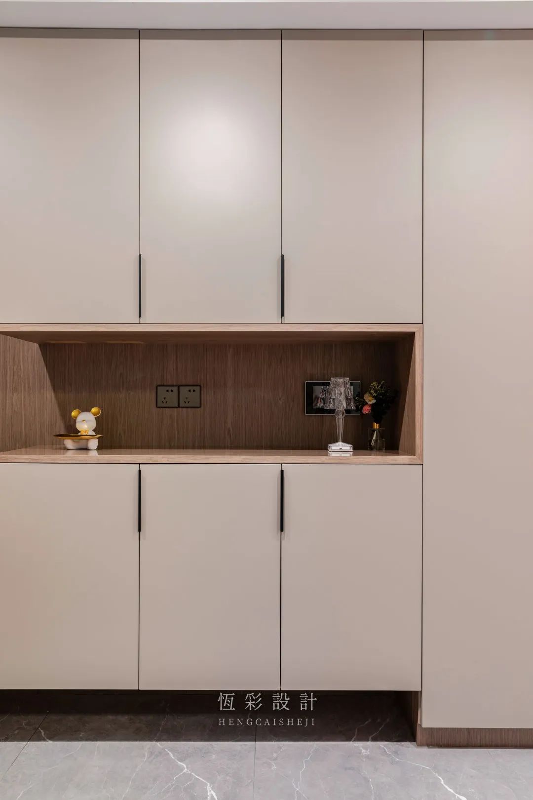 餐厅面积允许的话,餐边柜是一定要做的。顶柜太高不实用,触手可及的高度留出一排收纳格,腰部空档常规预留插座,后续添加小家电使用。