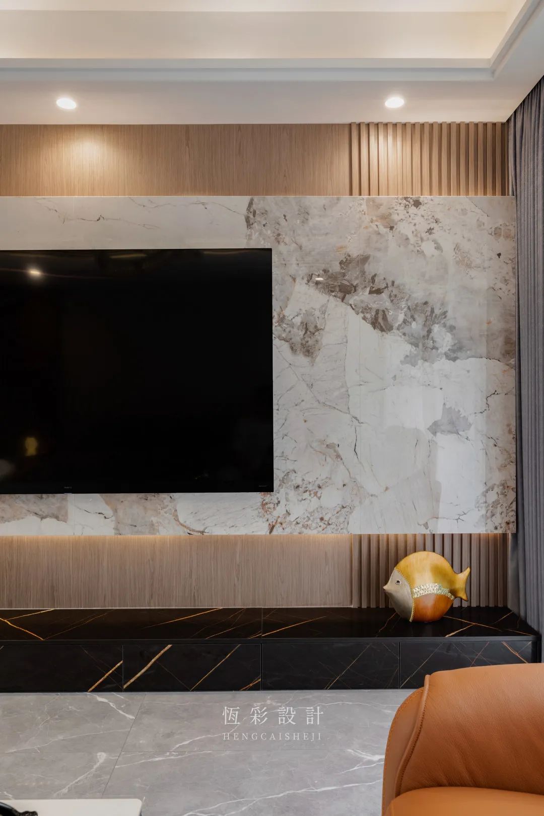 整块岩板做电视背景墙,木饰面拼接格栅做底板,霸气十足,相当有范儿!