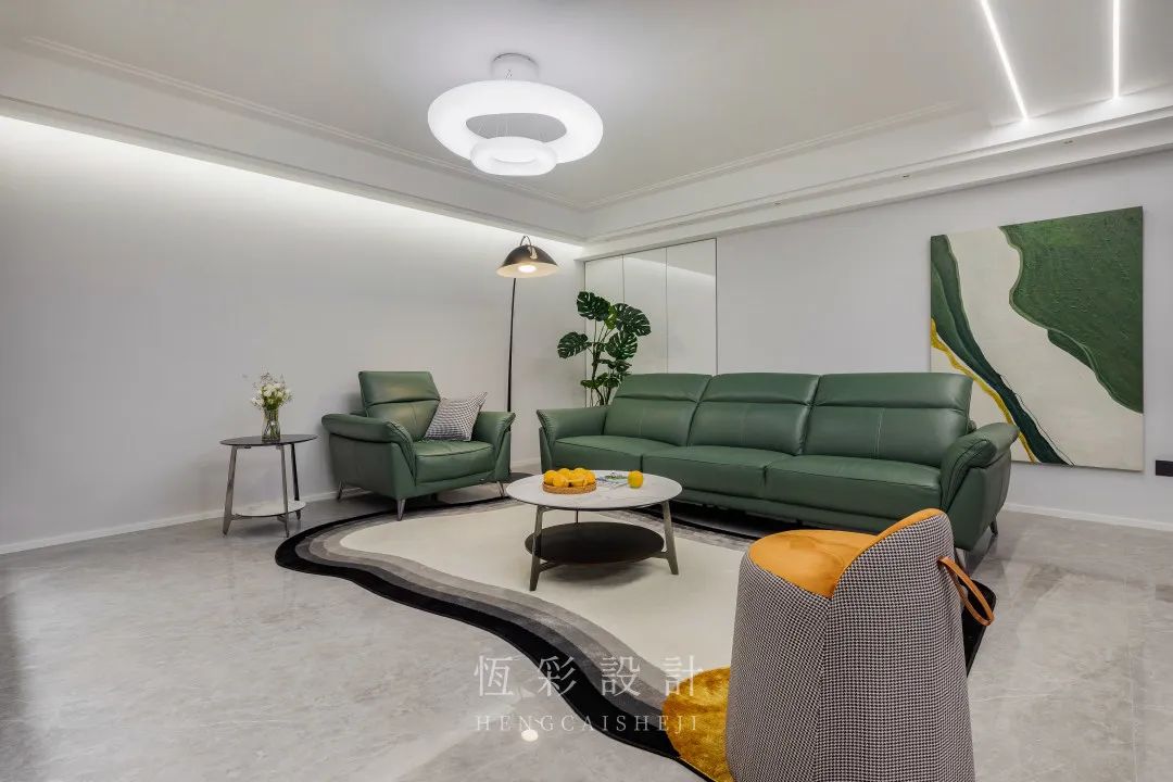 墨绿色,安稳而克制,生机勃勃而又成熟稳重。所以屋主选择它为全屋软装的主色。墨绿色的沙发在大面积的留白中尤其清爽,明黄色单人凳非常亮眼。
