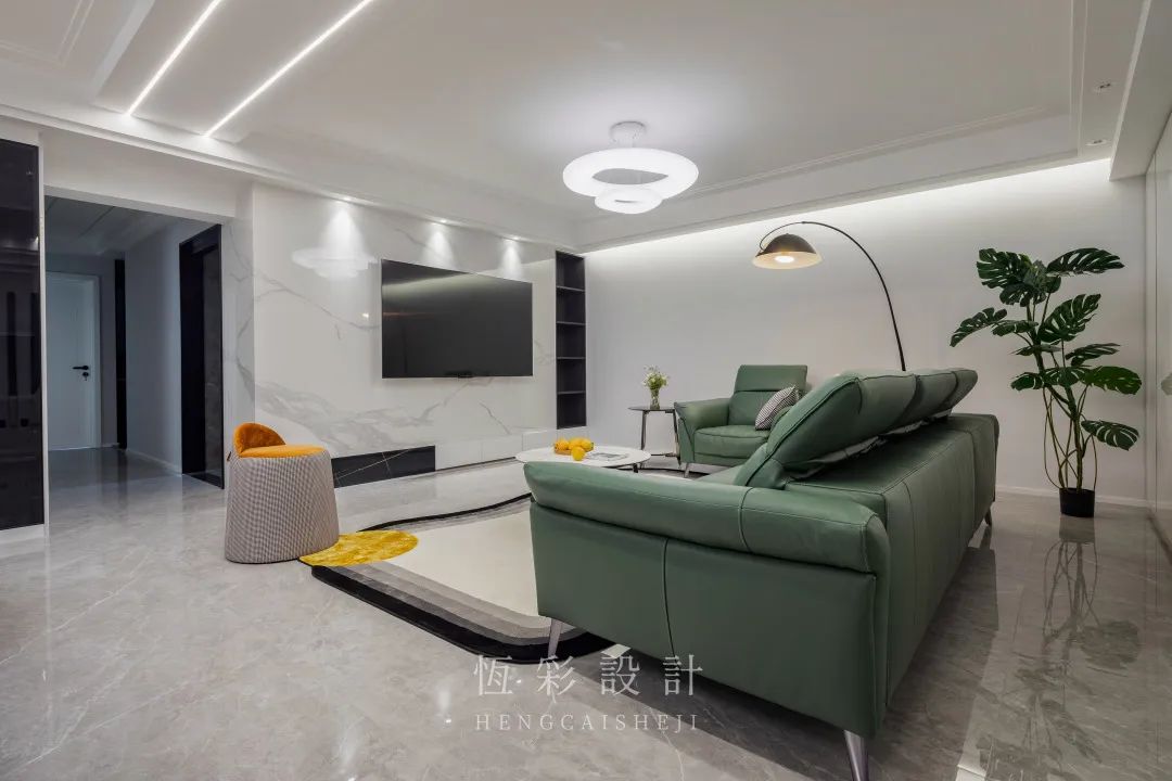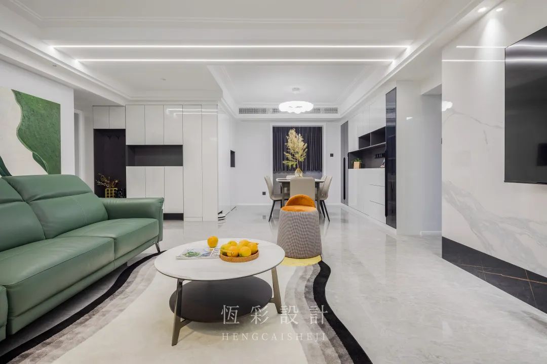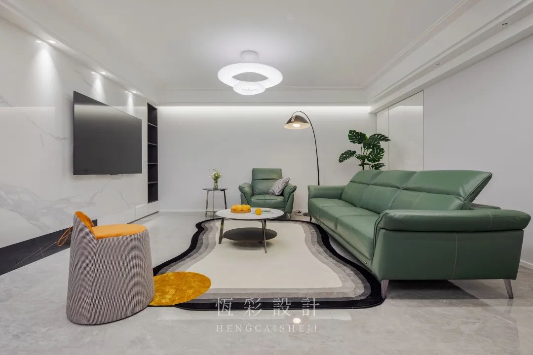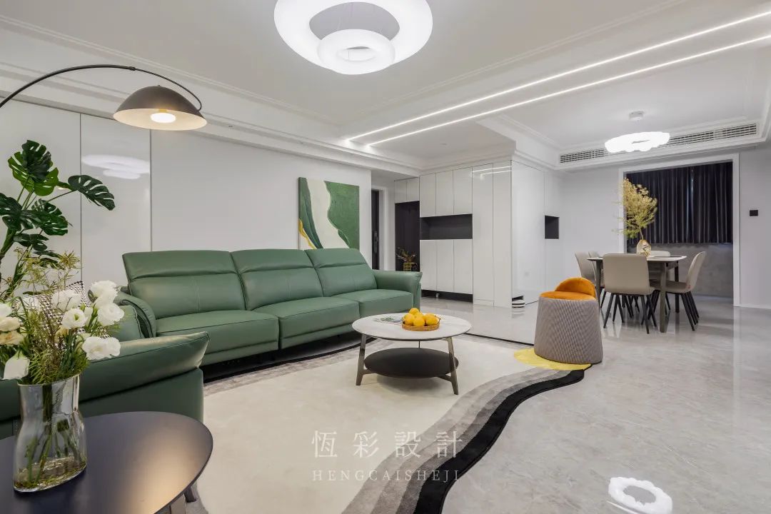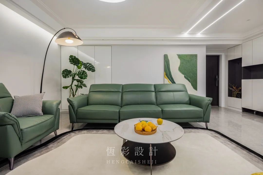 穿过玄关来到客厅,客厅硬装无杂色,大面积白色有放大视觉空间的作用。软装配色也很有格调,大面积墨绿色营造有清凉感的家居环境,明黄色作为点缀,亮眼却不突兀。