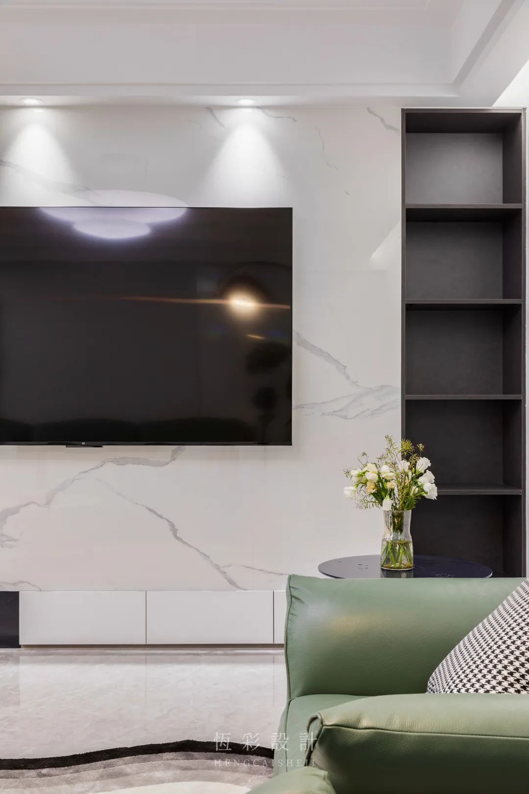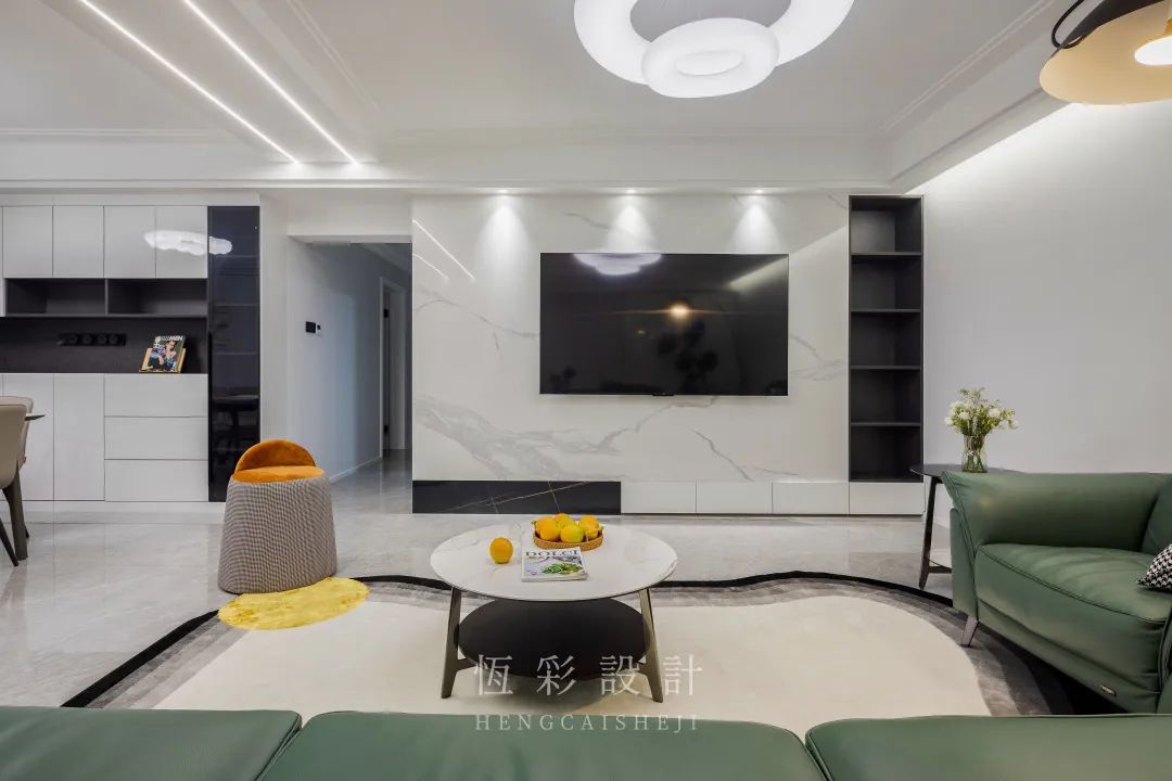 电视背景墙为岩板+定制柜,整面岩板霸气十足,线条利落。地台与背景墙在一个平面上,纯大理石的材质,以黄金分割比例拼接而成的黑白配,提高视觉层次感、设计感。