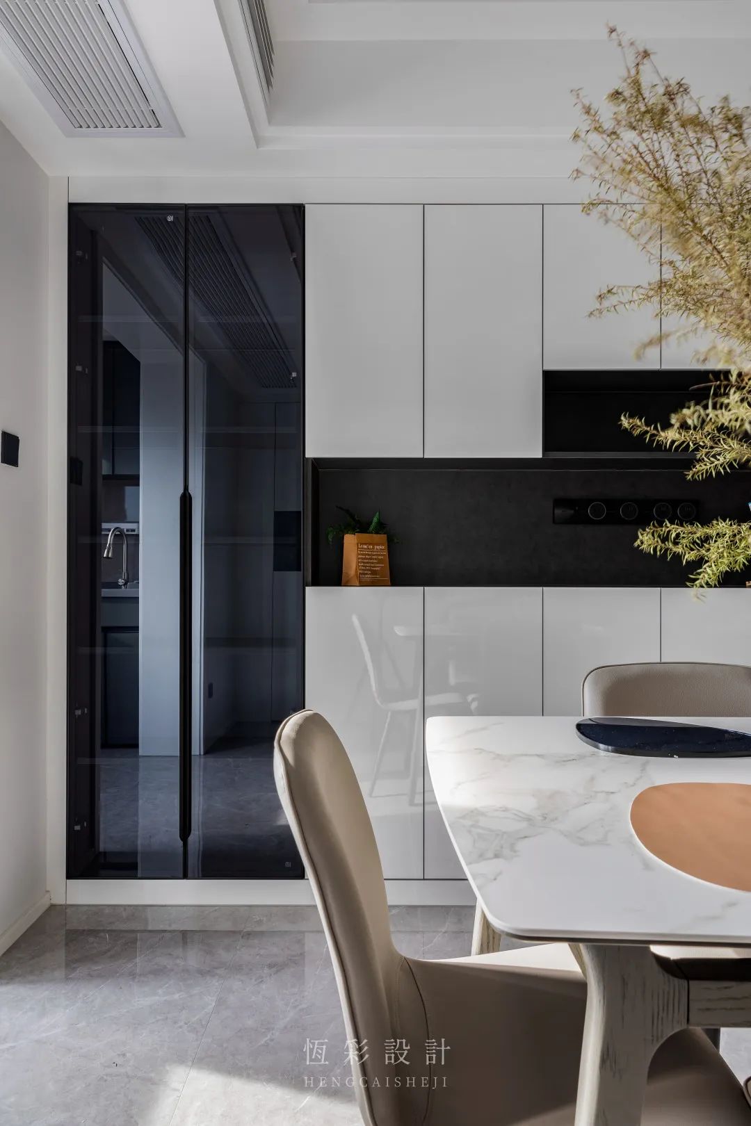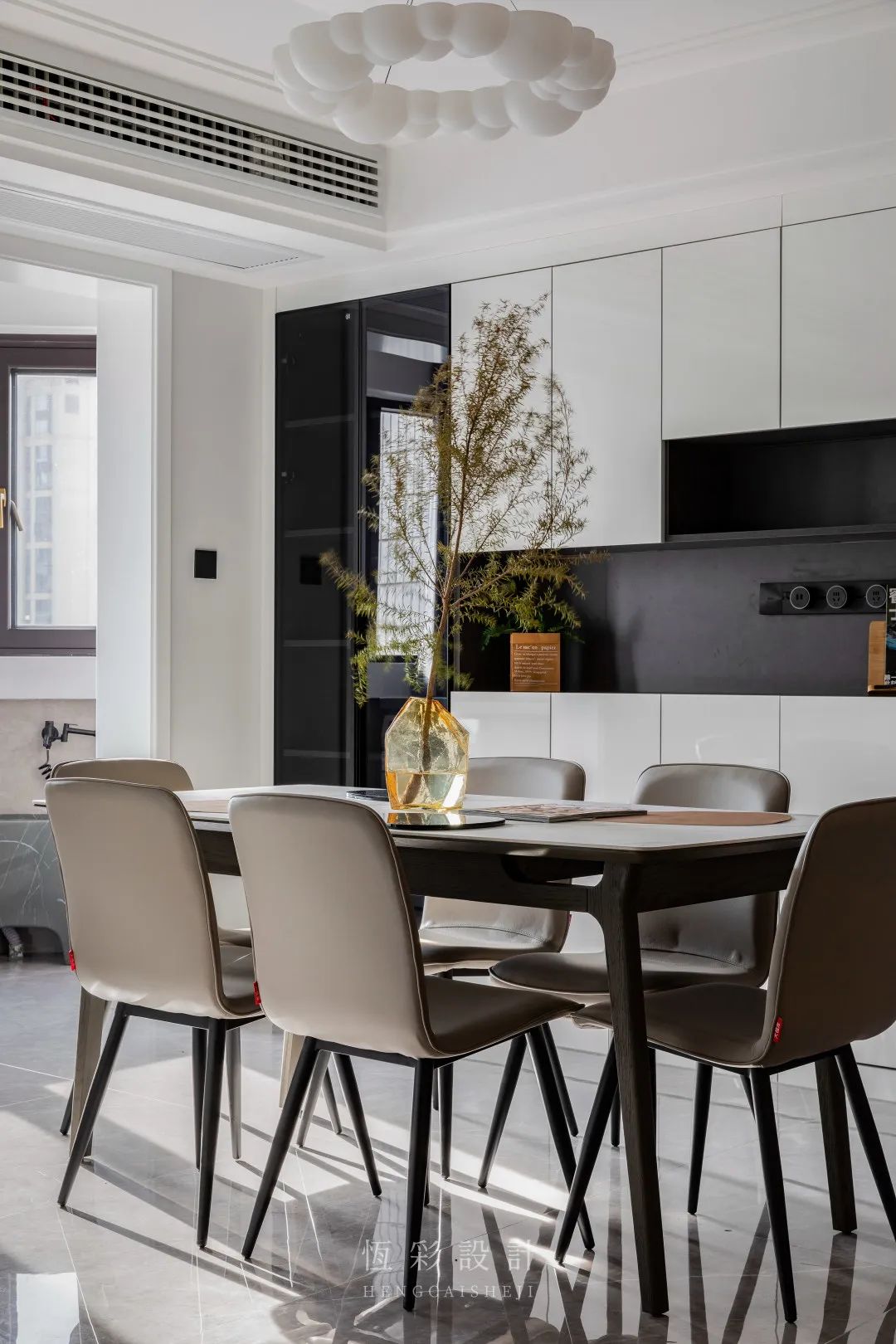 柜门统一白色,餐边柜收纳格与餐椅则选用黑色,视觉上增加层次感又不凌乱。