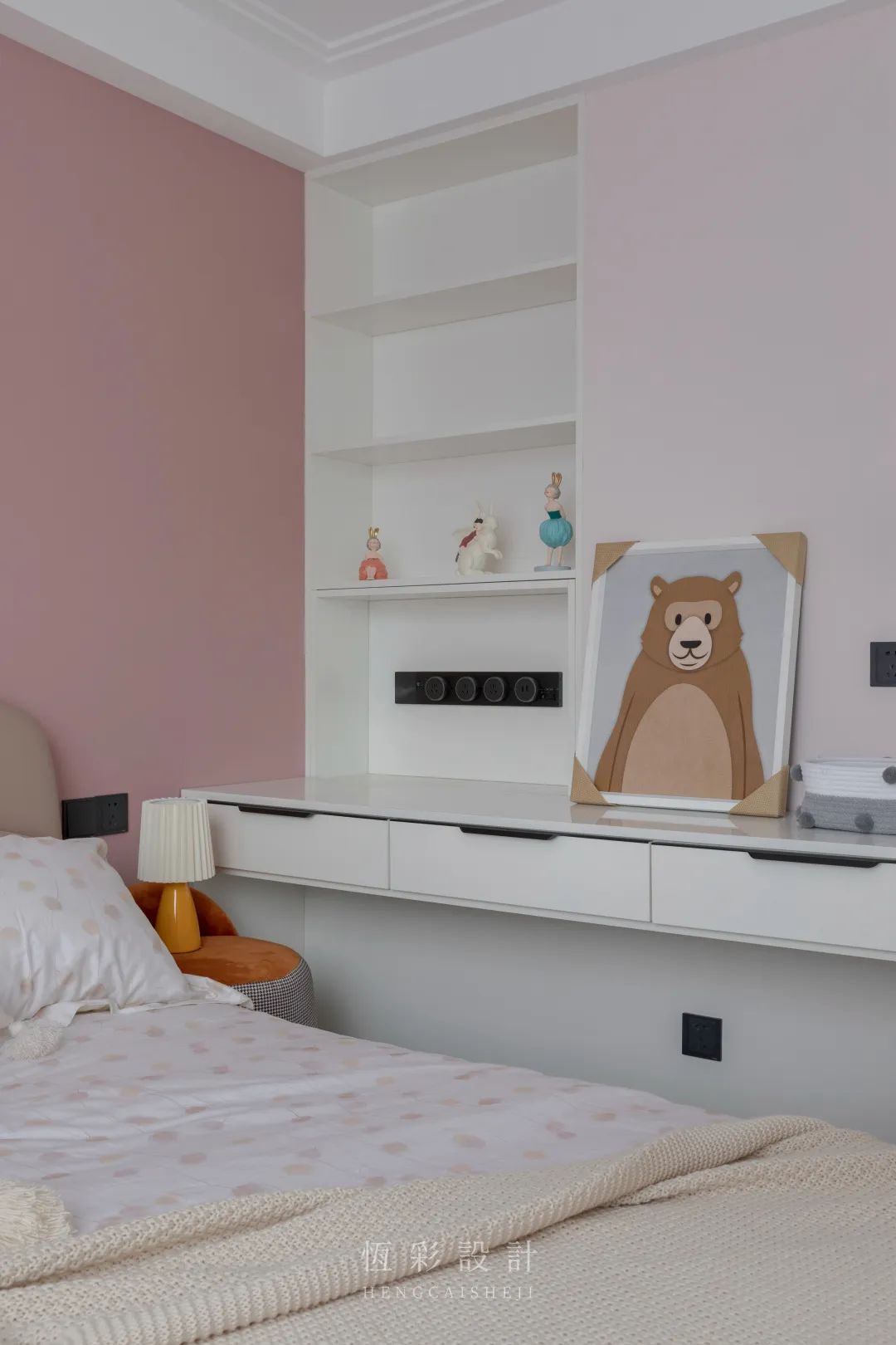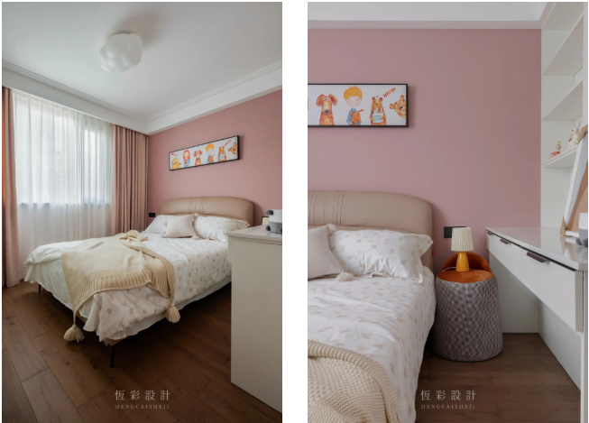女孩子爱粉色,宝贵的少女心当然要保护呀!背景墙和窗帘都安排上。