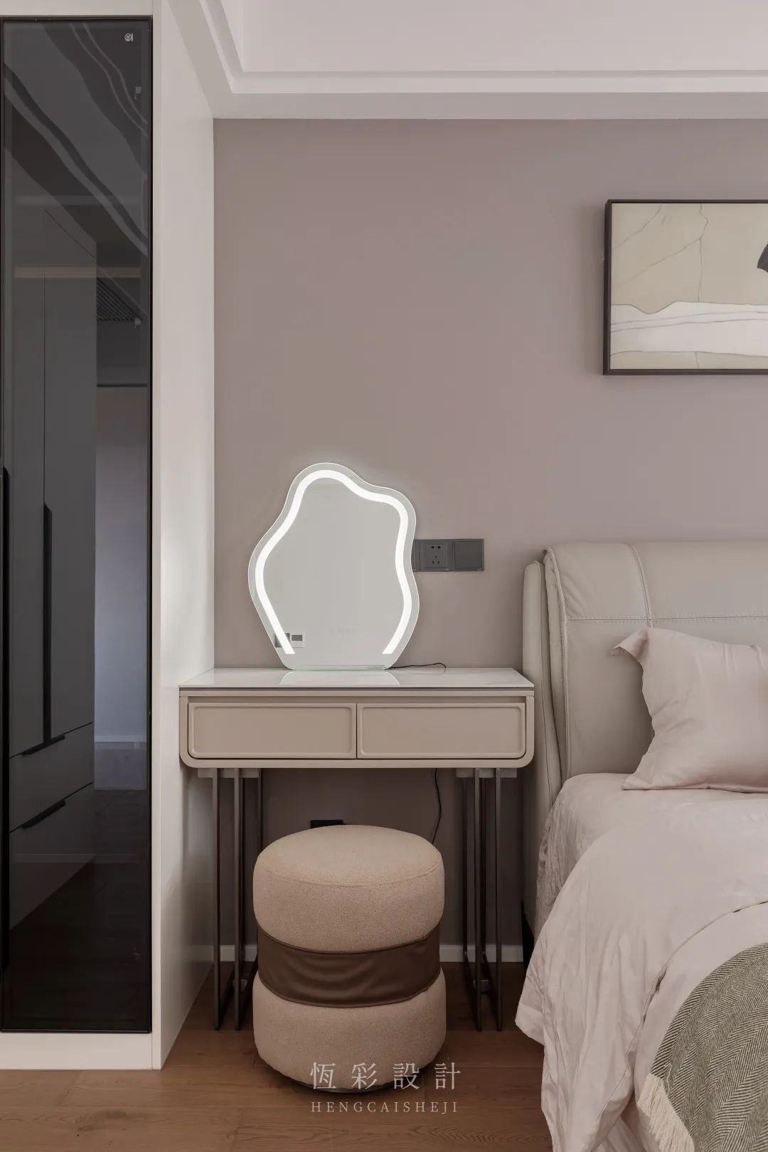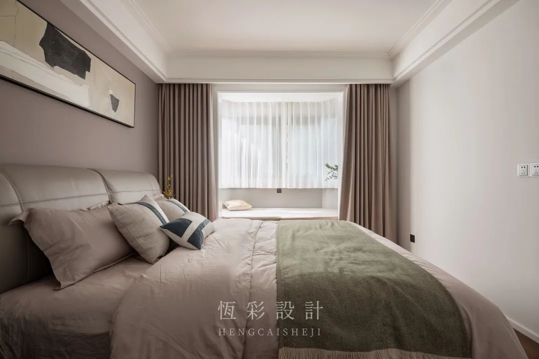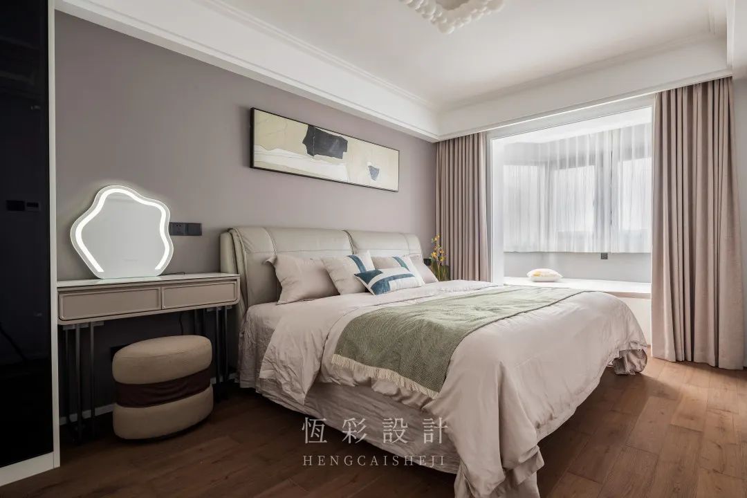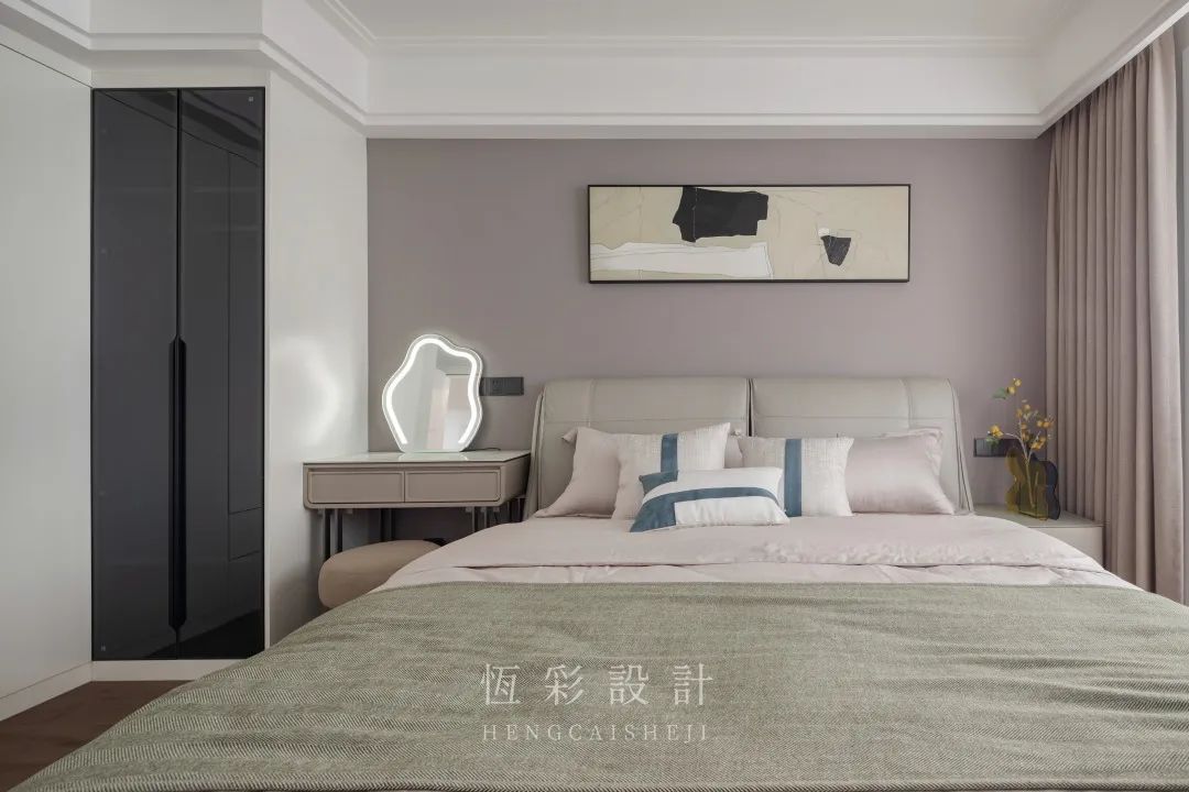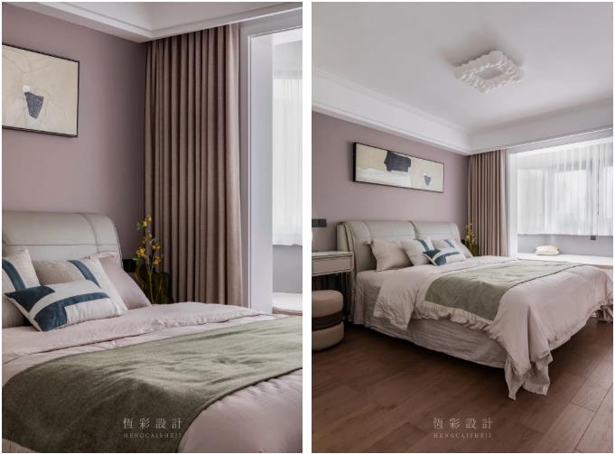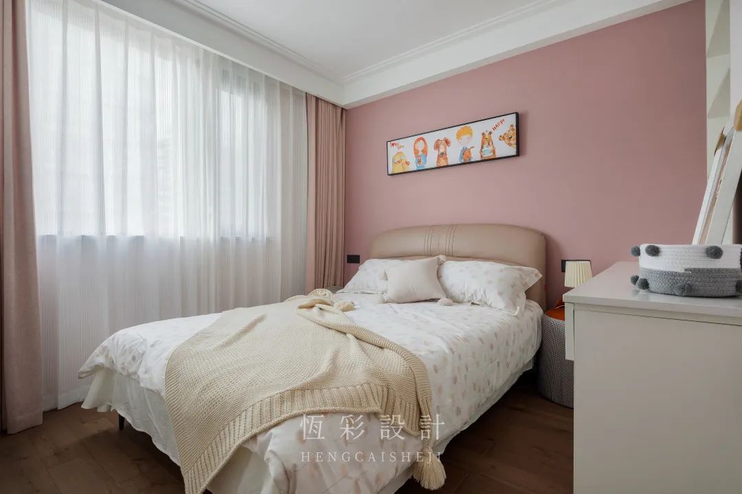 每天辛苦的工作结束后,只想回家睡个好觉,屋主对卧室的要求是温馨舒适。低饱和度的脏粉色内敛柔和,没有攻击性,粉色背景墙、窗帘和床品大面积使用。