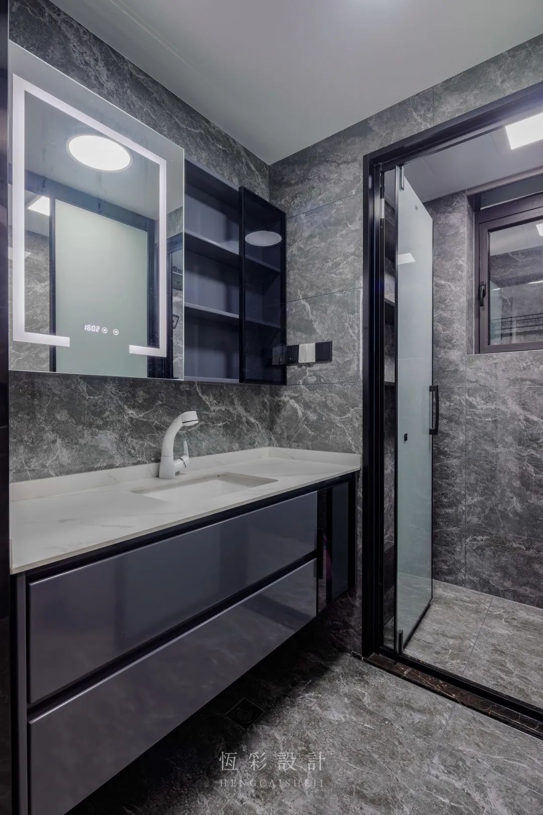 方形智能镜简单实用,设计壁龛充分利用墙面收纳空间。
