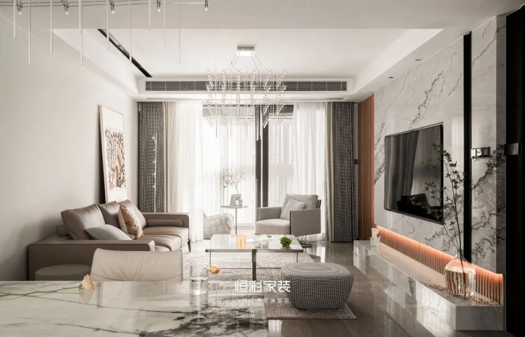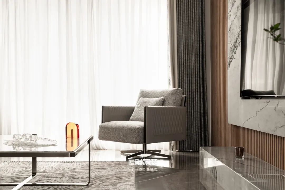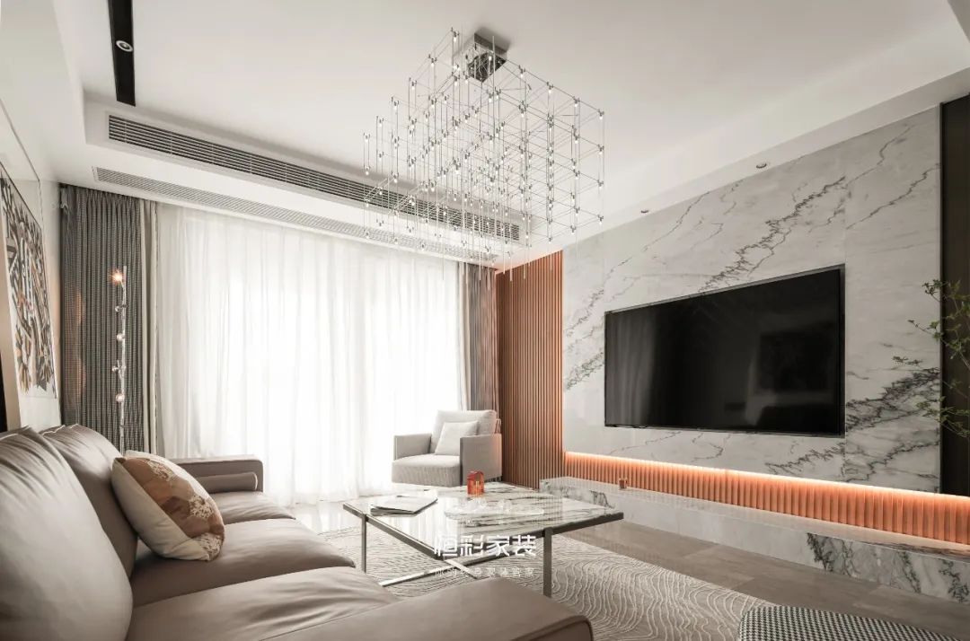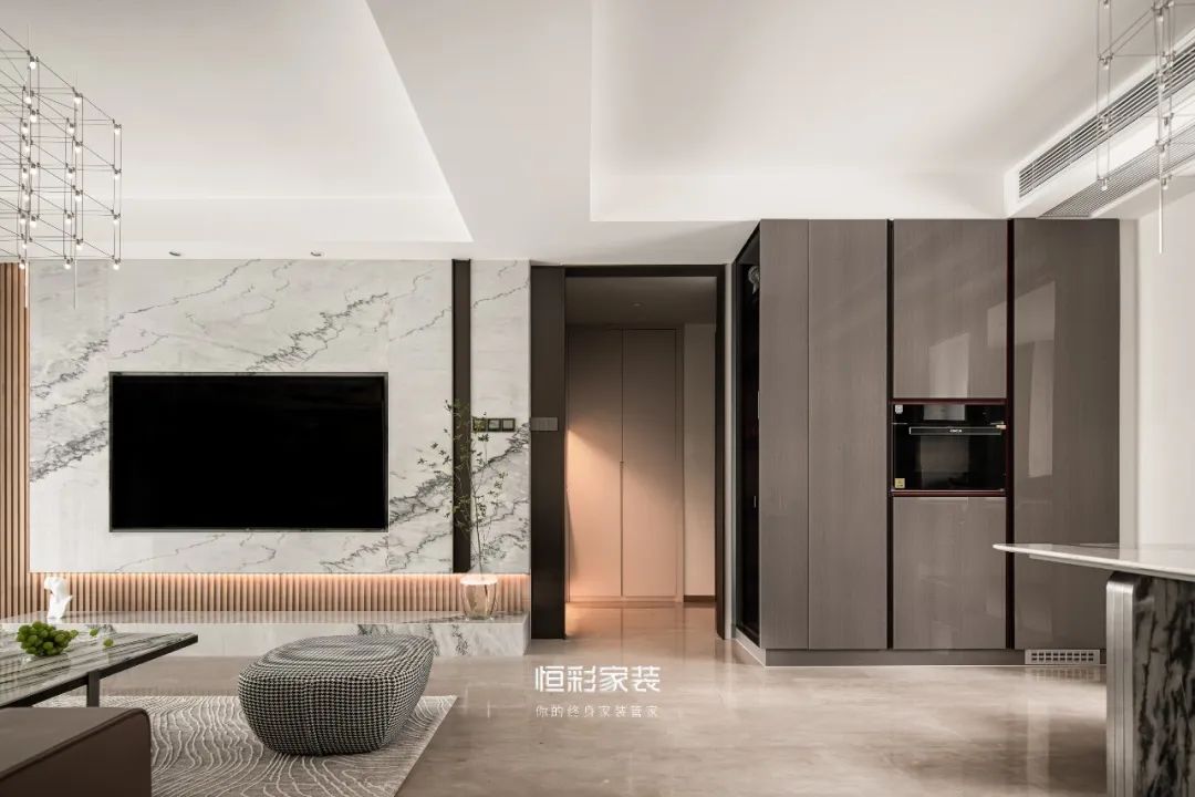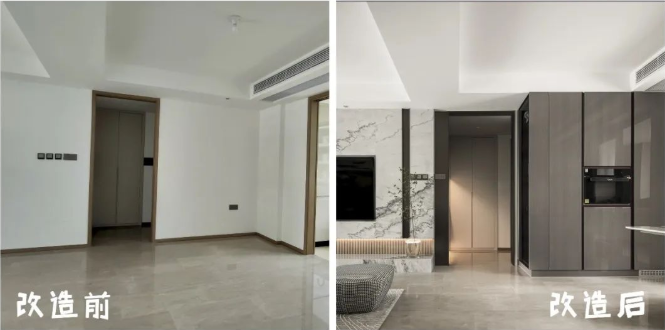 电视背景墙的处理,把原先精装修交付的房门拆除,换成了木格栅隐形门,与大理石电视背景作为一个融合的整体。