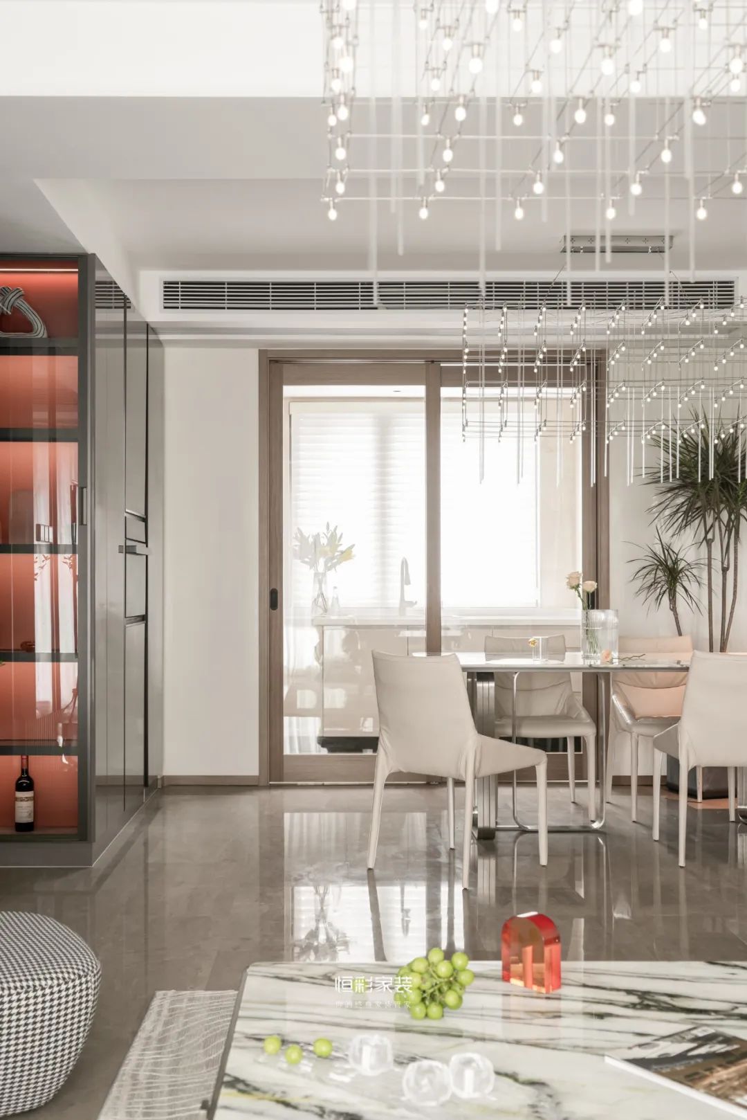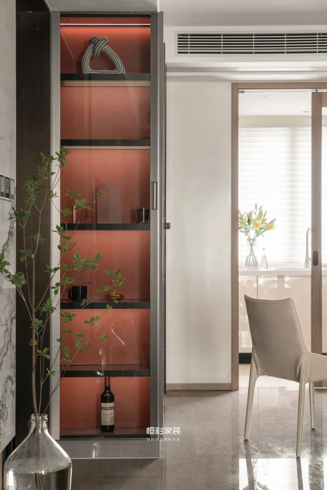 餐边柜是定制的,柜门板选择进口的pet板,通高的拉手延伸了整体的视觉效果,黑色不锈钢内嵌入了局部红色皮质。最右边做了嵌入式冰箱,主要用于存放水果饮料,和厨房的冰箱做区分,考虑到食物生熟之间不会串味,更新鲜健康。