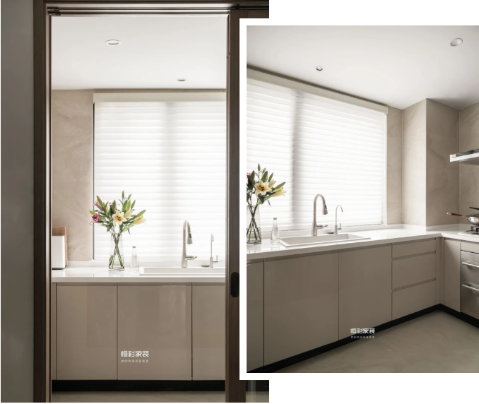 厨房空间在硬装上没有做改动,加了百叶帘,南北通透的户型让空间更明亮。