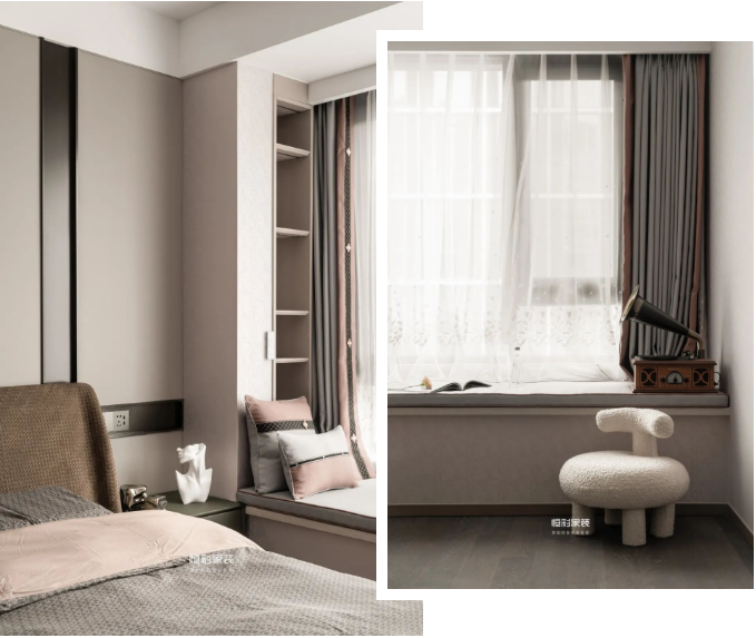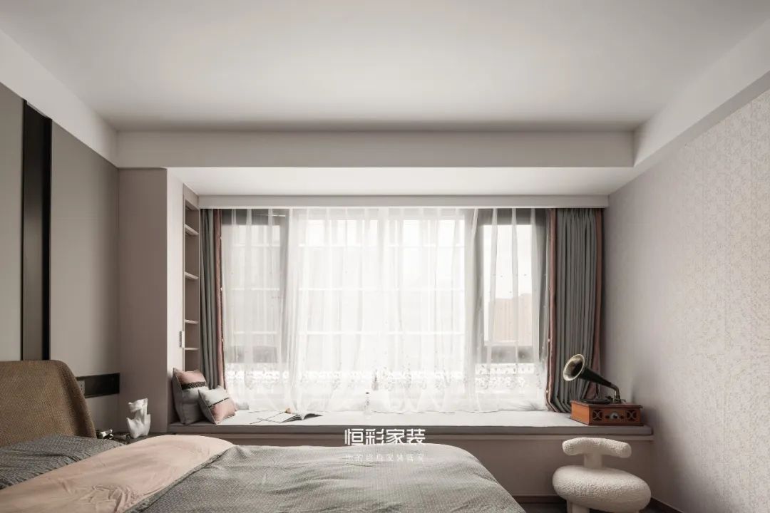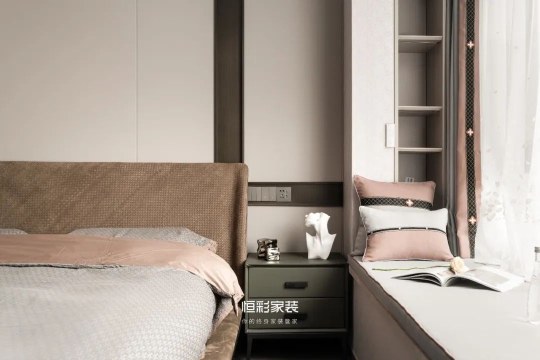 主卧飘窗保留,利用靠墙空间定制收纳柜很可。主卧床乍一看是布艺的,其实是编织皮的,编织的文艺图纹搭配真皮质感,多了几分随性的优雅。