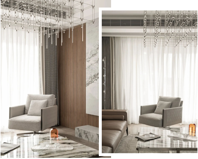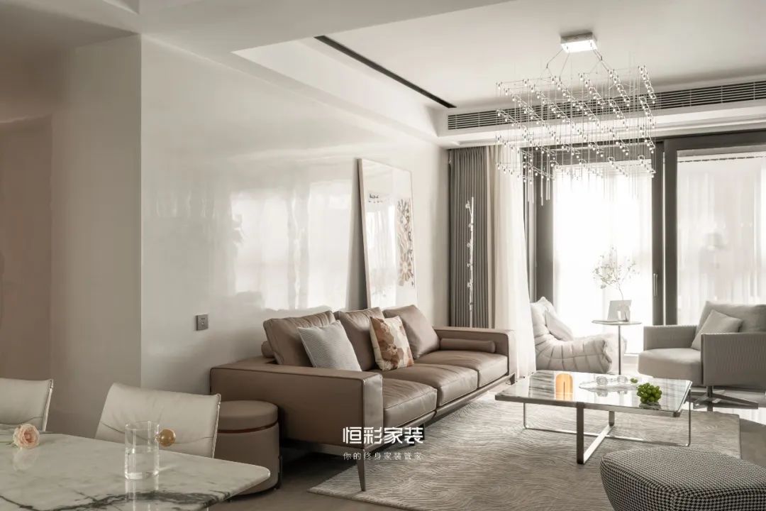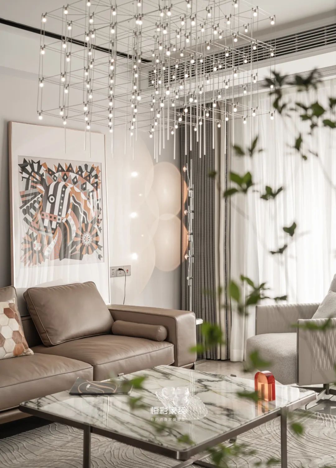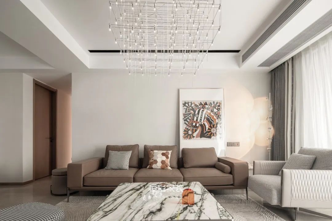 客厅主沙发选择棕色真皮沙发,装饰画选择爱马仕的丝巾靠画,画中的一抹橙色和局部的深棕色与主沙发的颜色相融合。沙发边上的网红氛围落地灯,光晕打在艺术涂料的墙面上显得非常柔和自然。