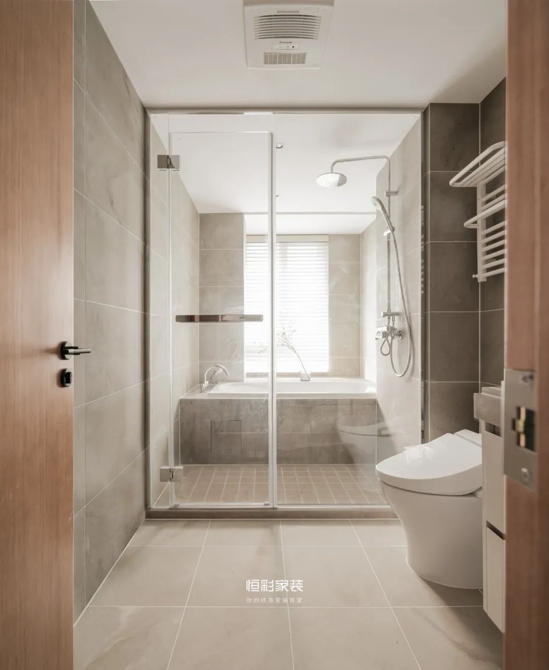 卫生间保留原始格局,通顶大玻璃推拉门很好地保证了采光、温度,同时也将干湿区进行分离处理。