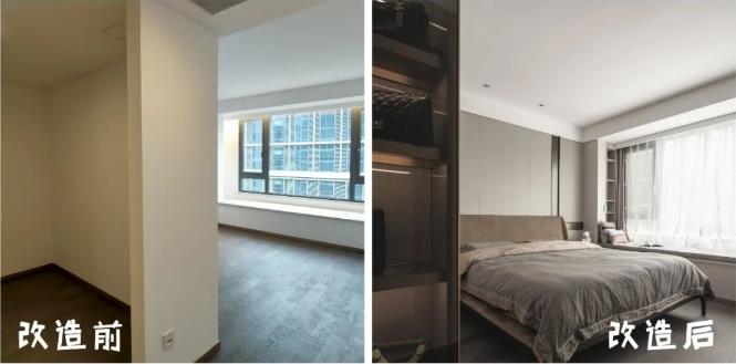 开发商交付时衣帽间和卧室之间有一堵墙,把这堵墙拆除定制了衣柜,这样过道宽敞了许多,也增大了收纳空间。
