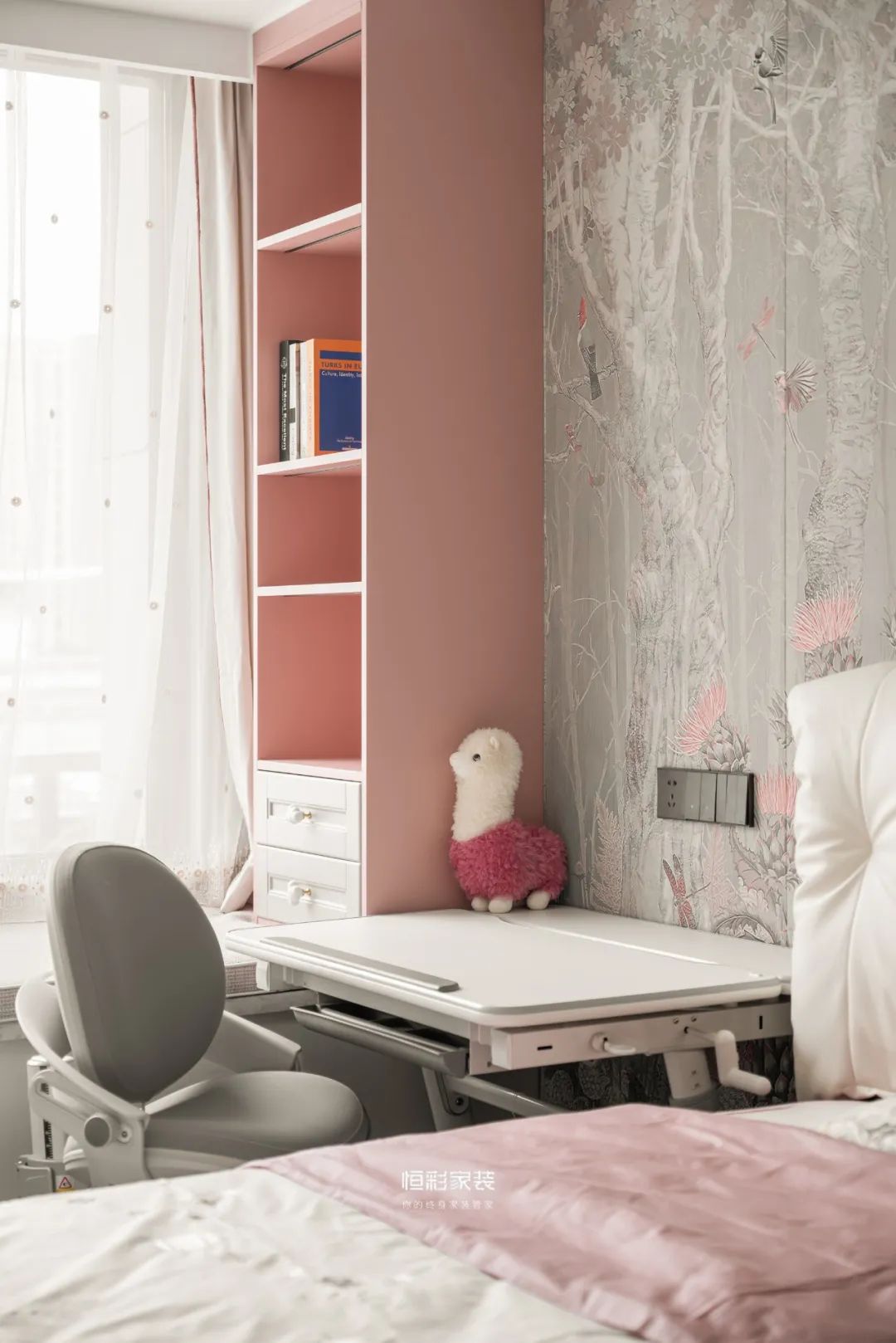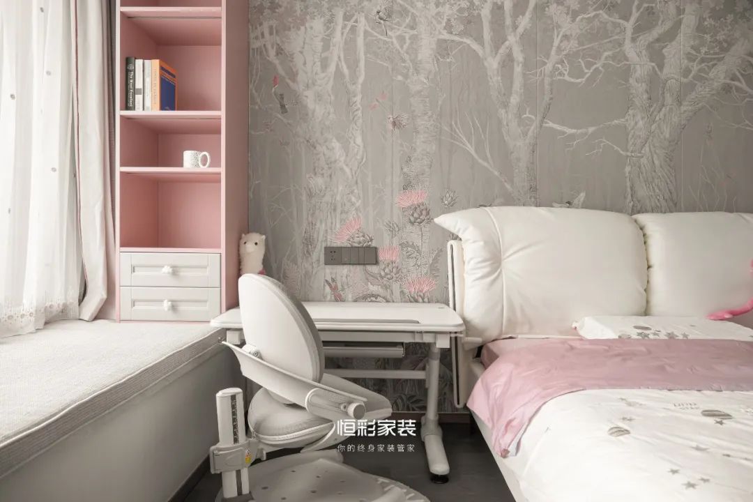 家里是女宝宝,所以儿童房整体色调采用了灰白粉,既温柔淡雅,又不失格调。壁画硬包床头背景,为整个空间增加质感。