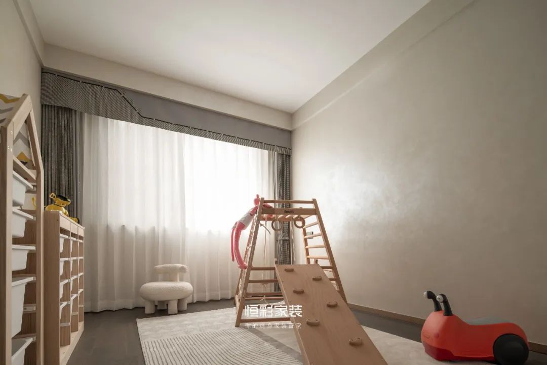 考虑到目前女宝的年龄阶段,屋主特地腾出了一个房间给宝宝作为玩耍的空间。墙面采用米色的意大利艺术涂料,给宝宝营造一种温馨的氛围,墙面也好打理,Faroro牌的攀爬架为宝宝提供娱乐项目。