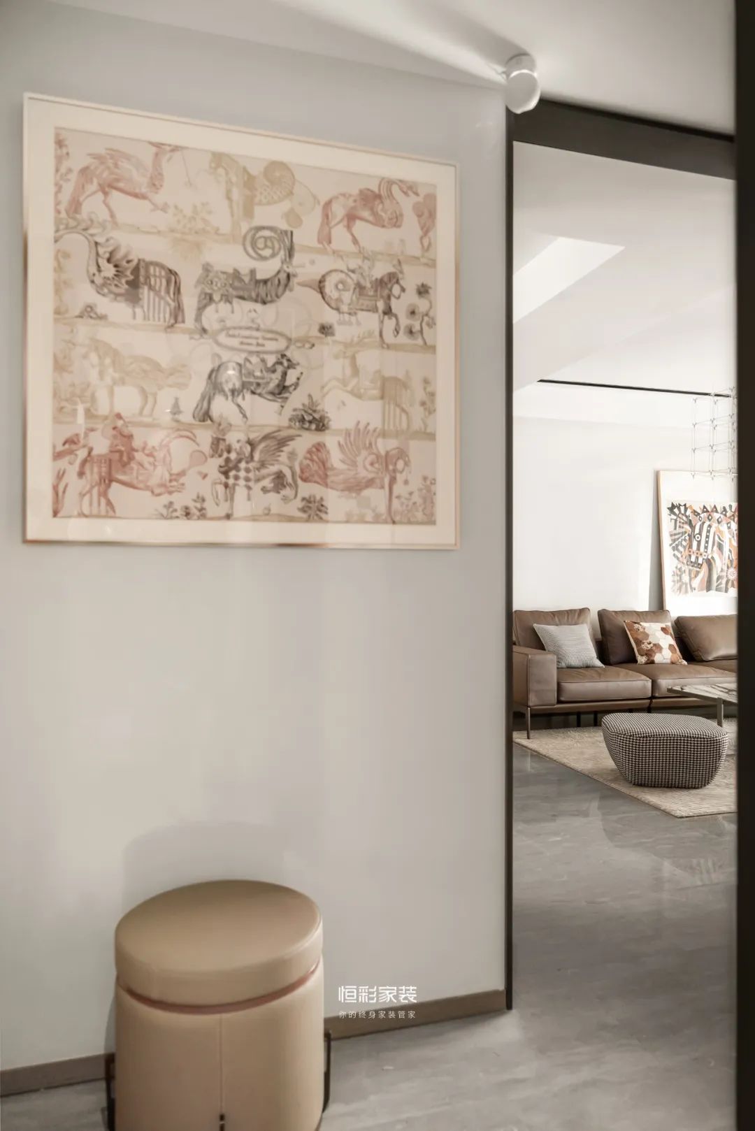 入户玄关门厅保留,隔断墙起视觉缓冲作用,保留了一些空间的神秘感和隐私,首先映入眼帘的爱马仕丝巾裱画,植入轻奢、优雅的品牌概念。