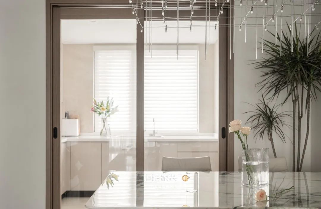 餐厅与厨房之间利用玻璃移门进行隔断,既不遮挡视线,又能很好地阻隔油烟,喜欢下厨的话不踩雷,很实用。