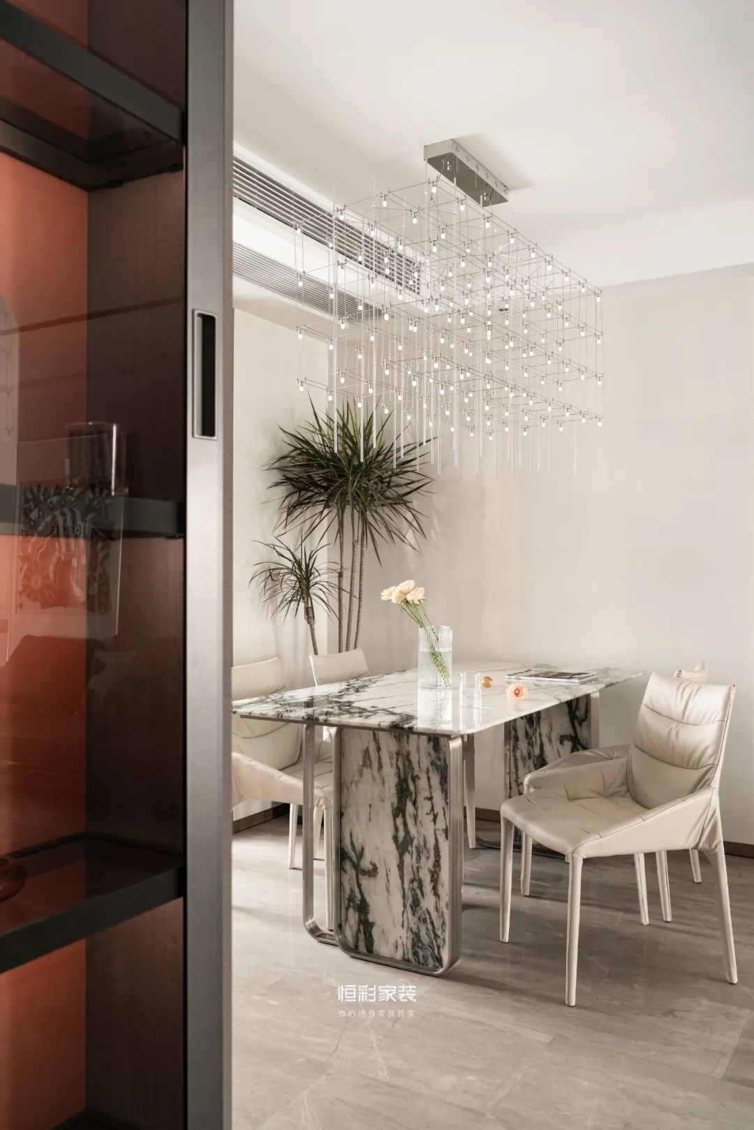 餐桌选择和客厅茶几同款的天然大理石,细长的不锈钢材质桌腿,家具颜色上选择低调不突兀的白色,从视觉上大大简化了餐厅空间的重心,同时可以腾出大大的空间,在餐椅不用的时候将餐椅全部收纳进餐桌底下,避免妨碍走动。