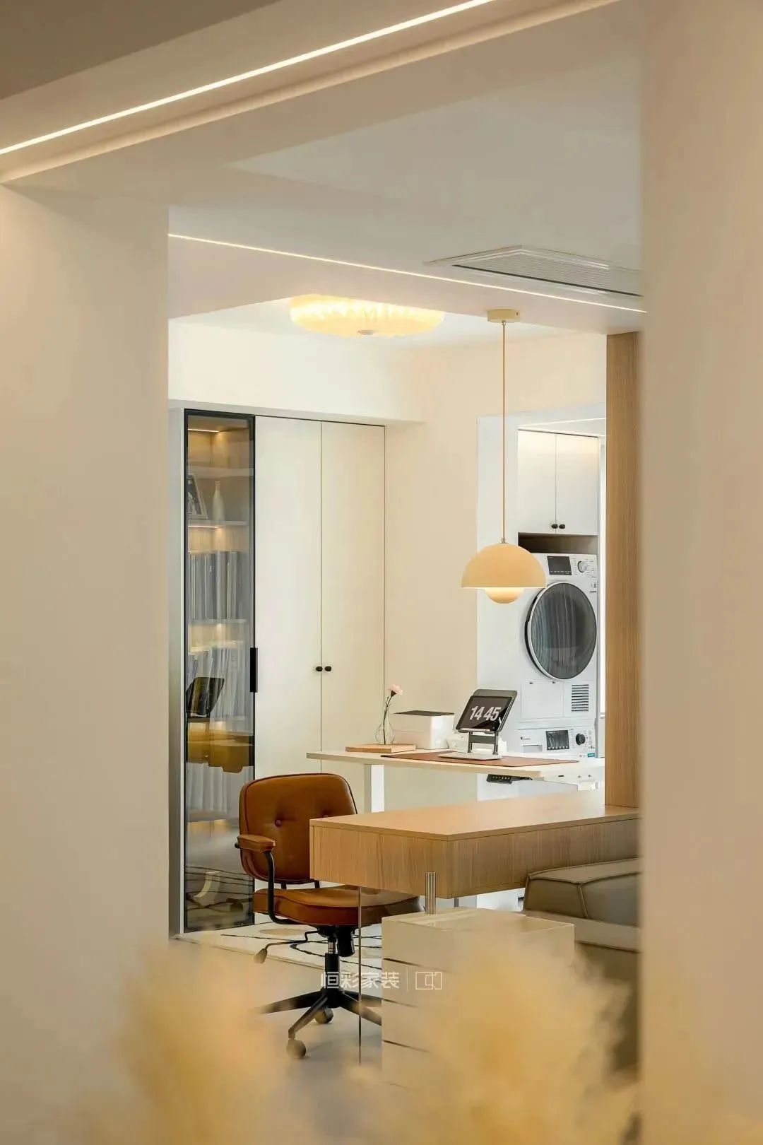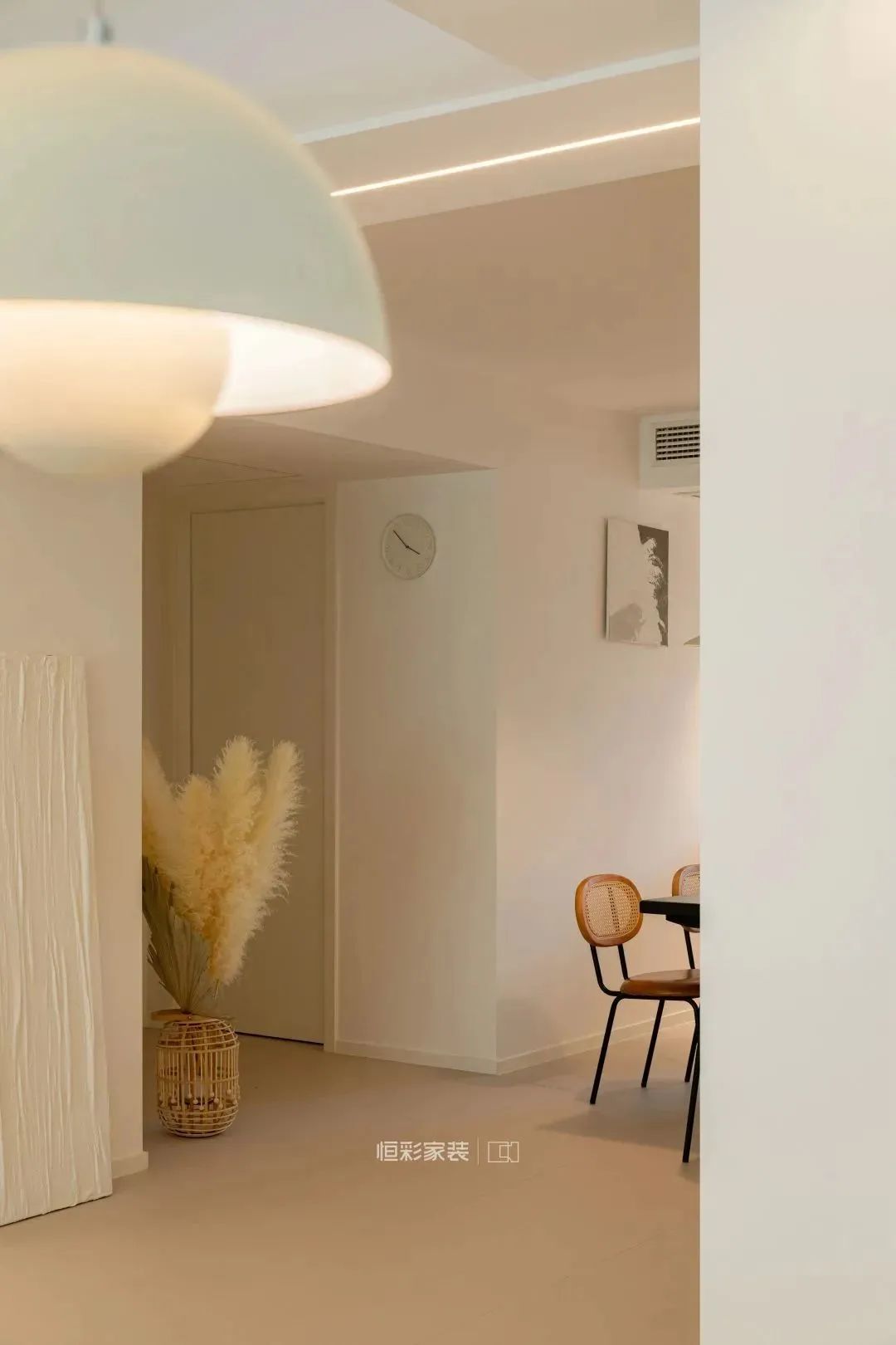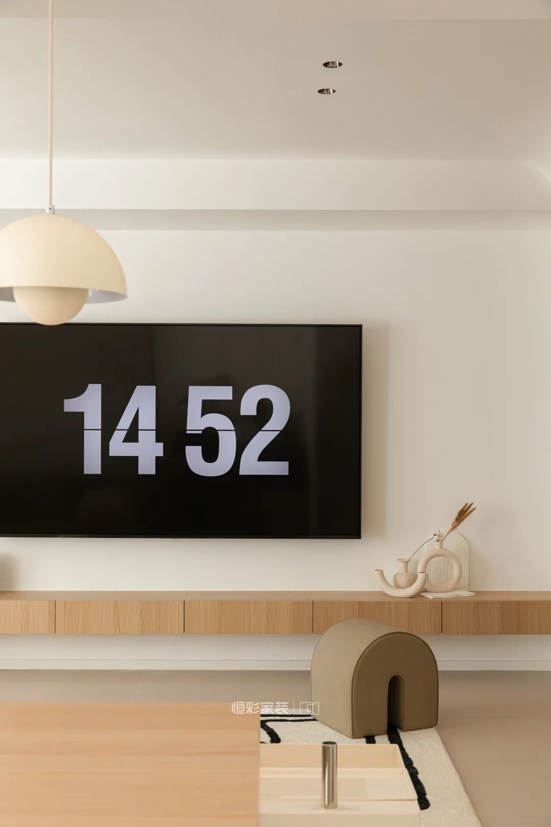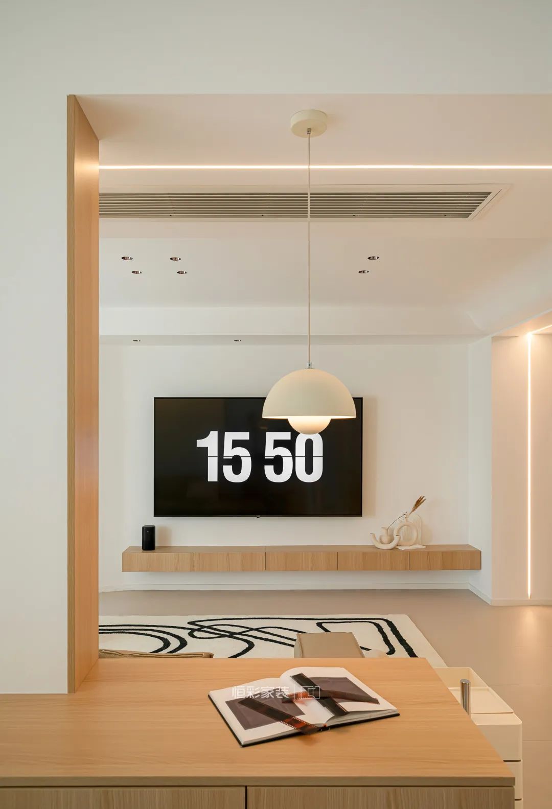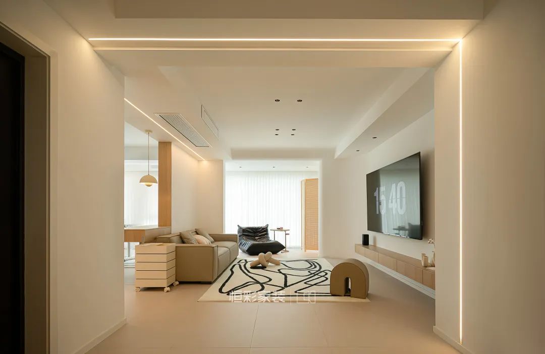 客厅拆除连接客厅与琴房之间的部分墙体,利用T字型墙体空间靠墙定制书桌,搭配一盏丹麦花苞小吊灯,满足日常使用过程中的照明需求,也能提升空间颜值。背景墙延伸处隔断墙做了灯带辅助设计,增加空间氛围感。