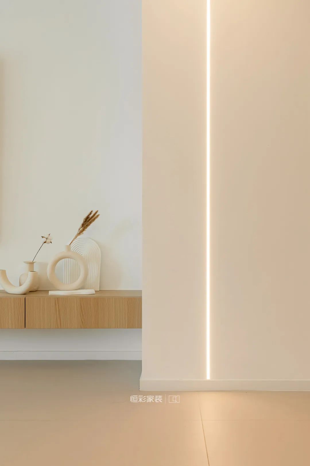 靠墙定制整排收纳柜,兼顾玄关收纳和餐边收纳功能。通过柜体的区别设计规划使用功能,镂空+底部悬空设计+整排立柜设计,木色板面保留了原始质感,增加了空间氛围感。