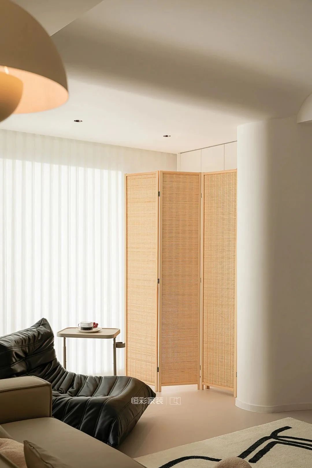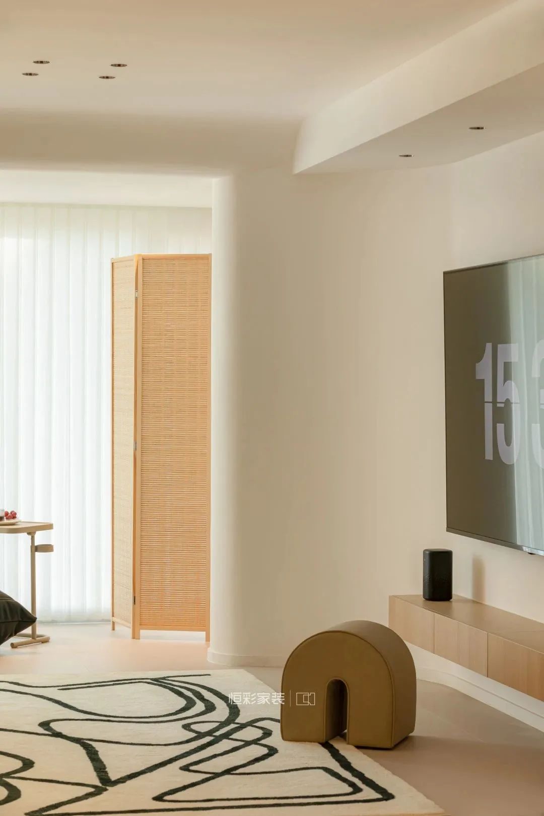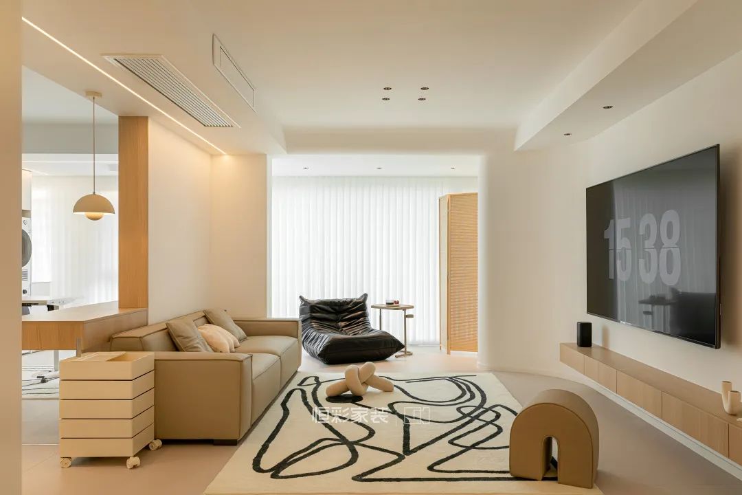 电视背景连接阳台墙体,做了一个弧形的包边处理,将硬朗的线条柔化,更加契合整个空间温暖柔和的色调。简约大白墙背景,靠墙定制悬空电视机柜,简单实用。小方几转移到阳台空间,搭配折叠竹编实木屏风隔断,打造休闲阳台的一方小天地。