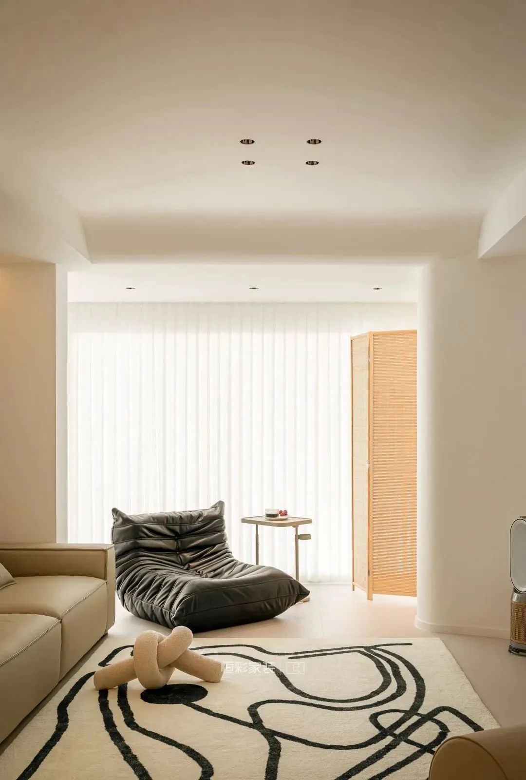 可移动简易沙发边柜简化空间视觉感,米色涂鸦毛毯搭配800*800木地板通铺协调整体空间配色。去茶几化设计,将空间去功能化,取而代之的是一些ins风简约小物件,去掉了对传统客厅的固有定义。利用阳台空间打造休闲区,从而将空间重心转移,增加空间的多样化。